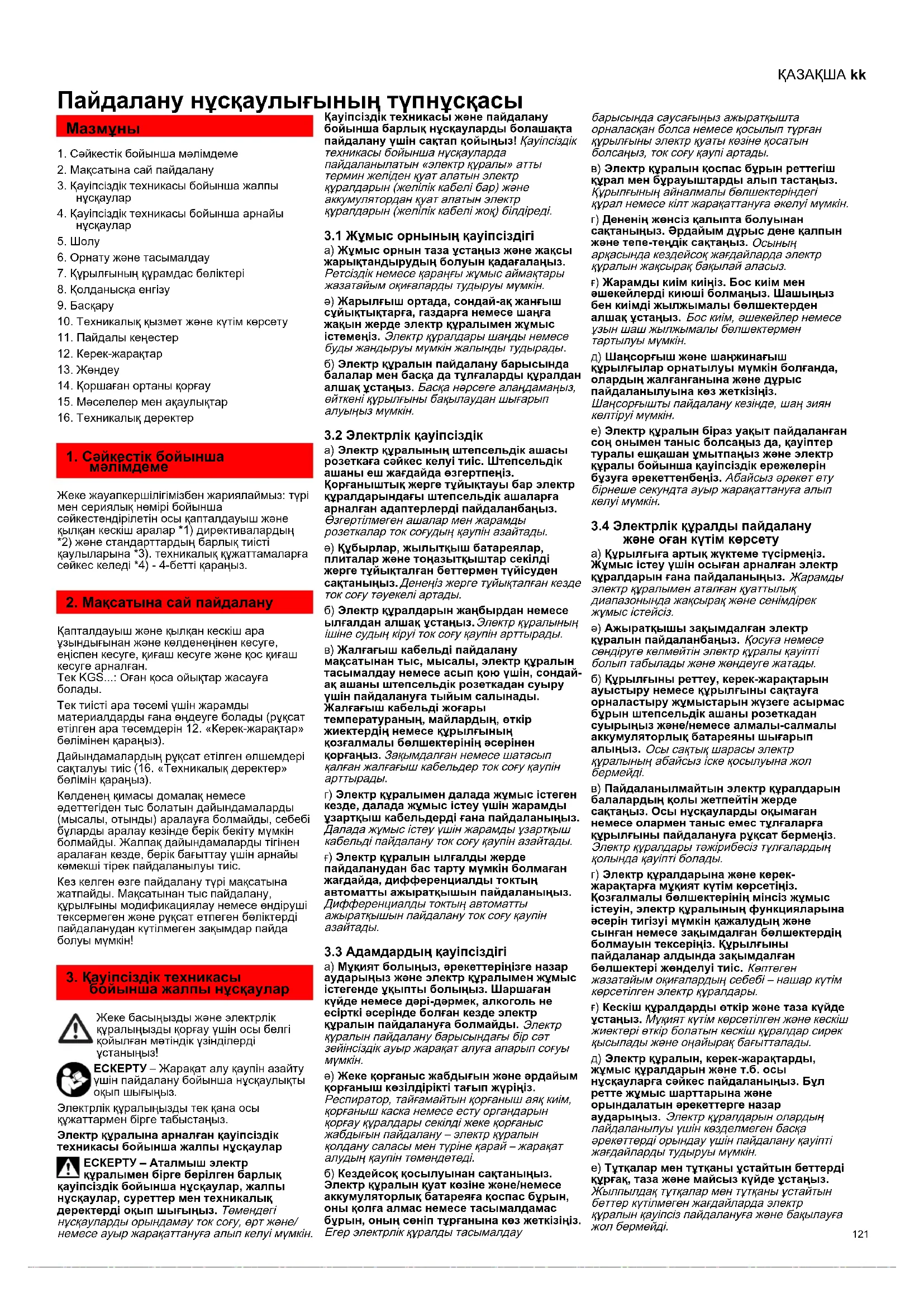 Пайдалану нұсқаулығының түпнұсқасы 1. Сәйкестік бойынша мәлімдеме2. Мақсатына сай пайдалану3. Қауіпсіздік техникасы бойынша жалпынұсқаулар4. Қауіпсіздік техникасы бойынша арнайынұсқаулар5. Шолу6. Орнату және тасымалдау7. Құрылғының құрамдас бөліктері8. Қолданысқа енгізу9. Басқару10. Техникалық қызмет және күтім көрсету11. Пайдалы кеңестер12. Керек-жарақтар13. Жөндеу14. Қоршаған ортаны қорғау15. Мәселелер мен ақаулықтар16. Техникалық деректерЖеке жауапкершілігімізбен жариялаймыз: түрі мен сериялық нөмірі бойынша сәйкестендірілетін осы қапталдауыш және қылқан кескіш аралар *1) директивалардың *2) және стандарттардың барлық тиісті қаулыларына *3). техникалық құжаттамаларға сәйкес келеді *4) - 4-бетті қараңыз.Қапталдауыш және қылқан кескіш ара ұзындығынан және көлденеңінен кесуге, еңіспен кесуге, қиғаш кесуге және қос қиғаш кесуге арналған. Тек KGS...: Оған қоса ойықтар жасауға болады.Тек тиісті ара төсемі үшін жарамды материалдарды ғана өңдеуге болады (рұқсат етілген ара төсемдерін 12. «Керек-жарақтар» бөлімінен қараңыз). Дайындамалардың рұқсат етілген өлшемдері сақталуы тиіс (16. «Техникалық деректер» бөлімін қараңыз). Көлденең қимасы домалақ немесе әдеттегіден тыс болатын дайындамаларды (мысалы, отынды) аралауға болмайды, себебі бұларды аралау кезінде берік бекіту мүмкін болмайды. Жалпақ дайындамаларды тігінен аралаған кезде, берік бағыттау үшін арнайы көмекші тірек пайдаланылуы тиіс. Кез келген өзге пайдалану түрі мақсатына жатпайды. Мақсатынан тыс пайдалану, құрылғыны модификациялау немесе өндіруші тексермеген және рұқсат етпеген бөліктерді пайдаланудан күтілмеген зақымдар пайда болуы мүмкін! Жеке басыңызды және электрлік құралыңызды қорғау үшін осы белгі қойылған мәтіндік үзінділерді ұстаныңыз!ЕСКЕРТУ – Жарақат алу қаупін азайту үшін пайдалану бойынша нұсқаулықты оқып шығыңыз.Электрлік құралыңызды тек қана осы құжаттармен бірге табыстаңыз.Электр құралына арналған қауіпсіздік техникасы бойынша жалпы нұсқауларЕСКЕРТУ – Аталмыш электр құралымен бірге берілген барлық қауіпсіздік бойынша нұсқаулар, жалпы нұсқаулар, суреттер мен техникалық деректерді оқып шығыңыз.
