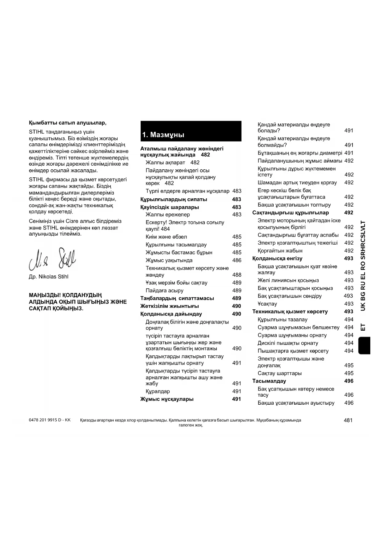 Сеніміңіз үшін Сізге алғыс білдіреміз және STIHL өнімдерінен көп ләззат алуыңызды тілейміз. Др. Nikolas Stihl МАҢЫЗДЫ! ҚОЛДАНУДЫҢ АЛДЫНДА ОҚЫП ШЫҒЫҢЫЗ ЖӘНЕ САҚТАП ҚОЙЫҢЫЗ. Қағазды ағартқан кезде хлор қолданылмады. Қалпына келетін қағазға басып шығарылған. Мұқабаның құрамында галоген жоқ.
