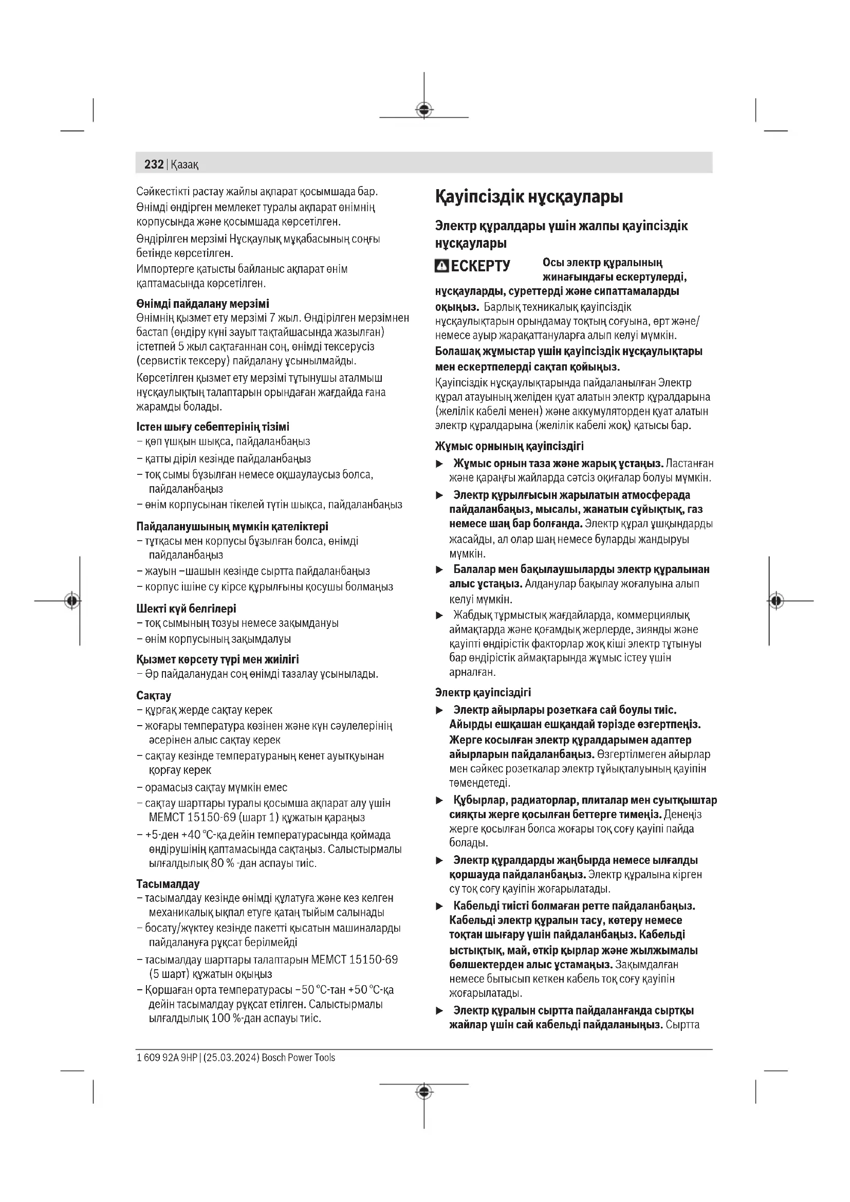 u Электр құралдарды жаңбырда немесе ылғалды қоршауда пайдаланбаңыз. Электр құралына кірген су тоқ соғу қауіпін жоғарылатады. u Кабельді тиісті болмаған ретте пайдаланбаңыз. Кабельді электр құралын тасу, көтеру немесе тоқтан шығару үшін пайдаланбаңыз. Кабельді ыстықтық, май, өткір қырлар және жылжымалы бөлшектерден алыс ұстамаңыз. Зақымдалған немесе бытысып кеткен кабель тоқ соғу қауіпін жоғарылатады. u Электр құралын сыртта пайдаланғанда сыртқы жайлар үшін сай кабельді пайдаланыңыз. Сыртта 1 609 92A 9HP | (25.03.2024) Bosch Power ToolsҚазақ | 233 пайдалануға жарамды кабельді пайдалану тоқ соғу қауіпін төмендейді. u Егер электр құралын ылғалды жерде пайдалану керек болса, онда қорғайтын өшіру құрылғысы (RCD) арқылы қорғалған тоқ желісін пайдаланыңыз. RCD пайдалану тоқ соғу қауіпін төмендетеді. Жеке қауіпсіздік u Электр құралды пайдалануда абай болыңыз, жұмысыңызды бақылаңыз және парасатты пайдаланыңыз. Электр құралды шаршаған кезде немесе есірткі, алкоголь немесе дәрі әсер еткен кезде пайдаланбаңыз. Электр құралын пайдалану кезінде аңсыздық ауыр жеке жарақаттануға алып келуі