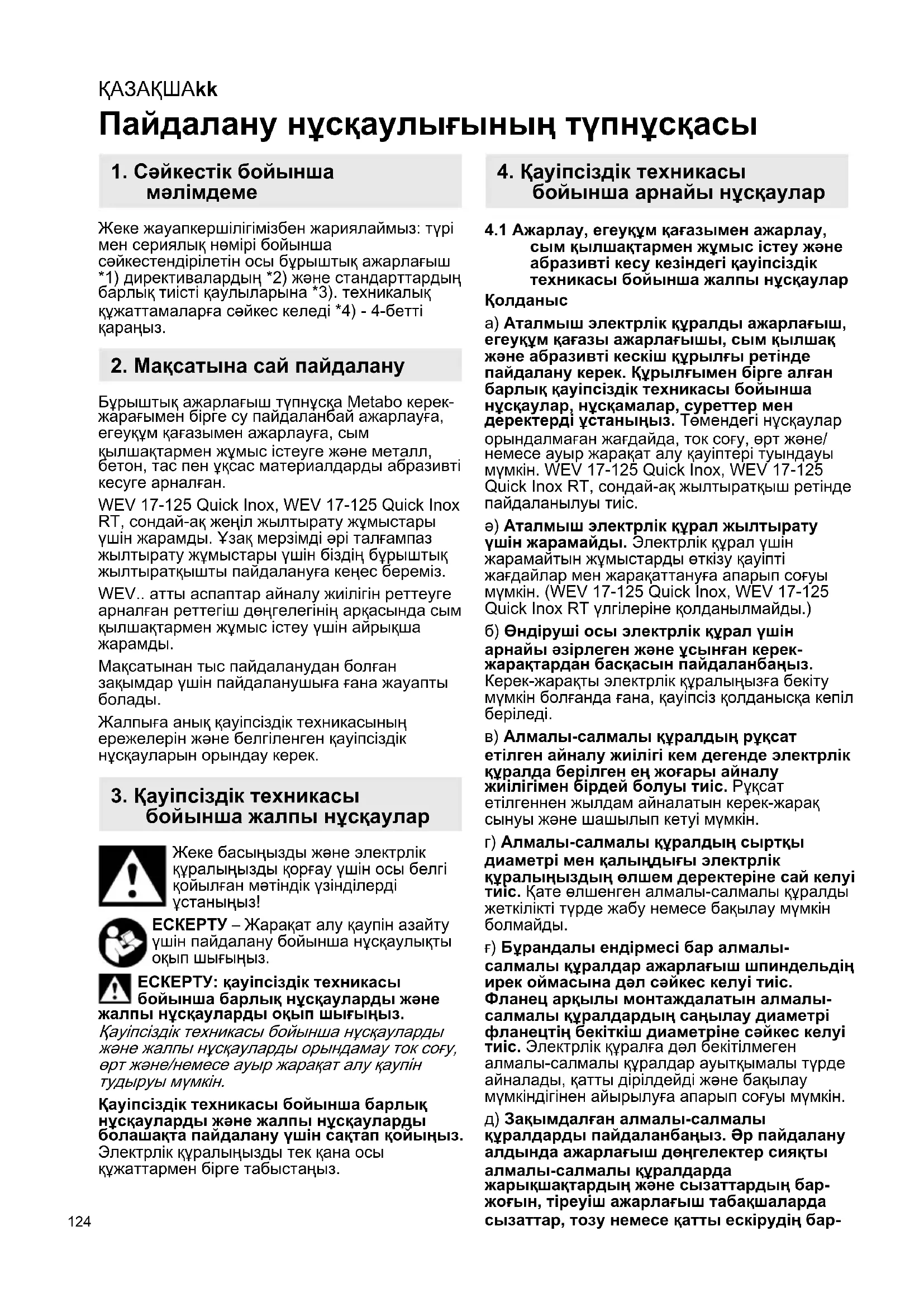 а) Аталмыш электрлік құралды ажарлағыш, егеуқұм қағазы ажарлағышы, сым қылшақ және абразивті кескіш құрылғы ретінде пайдалану керек. Құрылғымен бірге алған барлық қауіпсіздік техникасы бойынша нұсқаулар, нұсқамалар, суреттер мен деректерді ұстаныңыз. Төмендегі нұсқаулар орындалмаған жағдайда, ток соғу, өрт және/ немесе ауыр жарақат алу қауіптері туындауы мүмкін. WEV 17-125 Quick Inox, WEV 17-125 Quick Inox RT, сондай-ақ жылтыратқыш ретінде пайдаланылуы тиіс. ә) Аталмыш электрлік құрал жылтырату үшін жарамайды. Электрлік құрал үшін жарамайтын жұмыстарды өткізу қауіпті жағдайлар мен жарақаттануға апарып соғуы мүмкін. (WEV 17-125 Quick Inox, WEV 17-125 Quick Inox RT үлгілеріне қолданылмайды.) б) Өндіруші осы электрлік құрал үшін арнайы әзірлеген және ұсынған керек- жарақтардан басқасын пайдаланбаңыз. Керек-жарақты электрлік құралыңызға бекіту мүмкін болғанда ғана, қауіпсіз қолданысқа кепіл