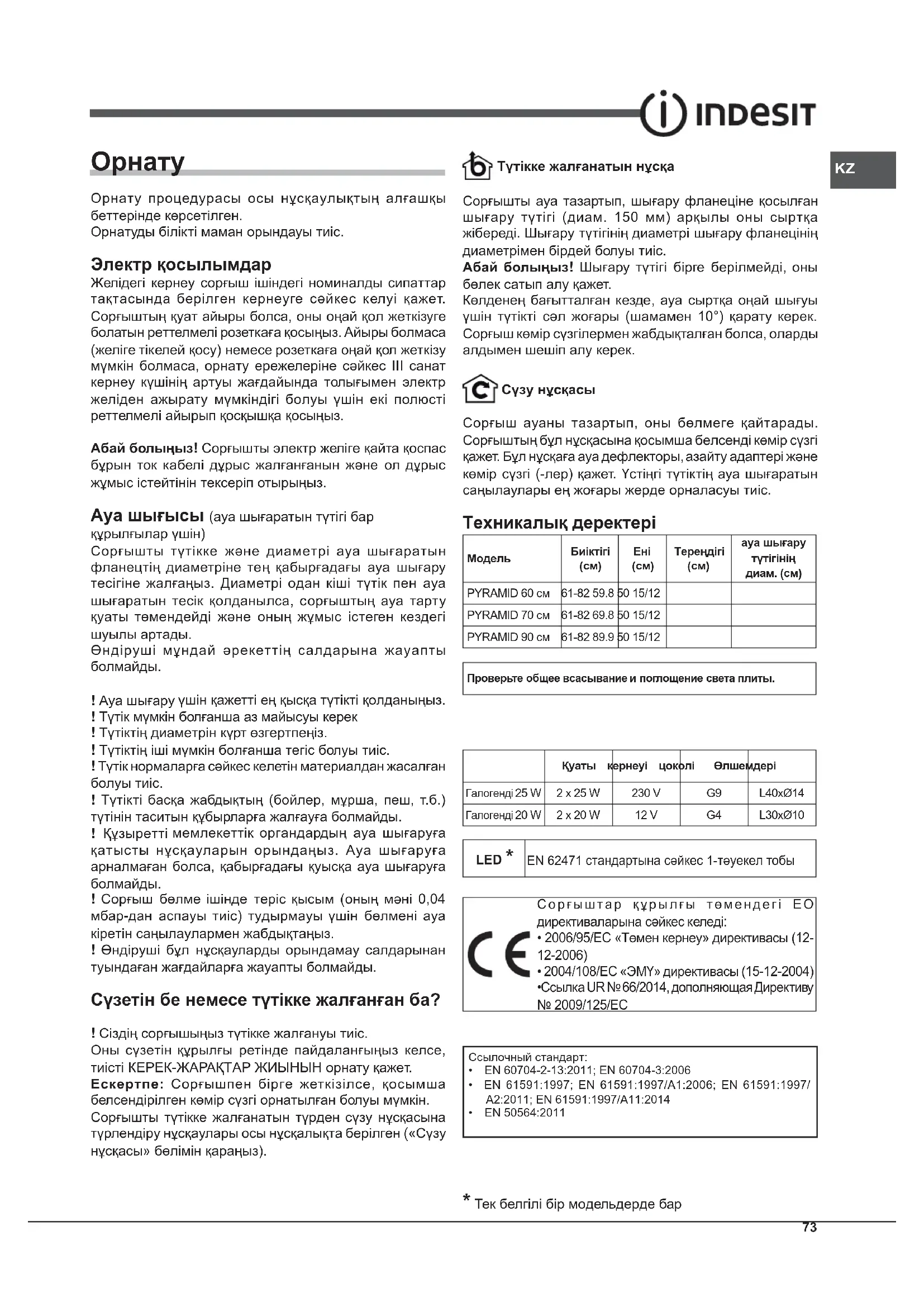 Сорғыш көмір сүзгілермен жабдықталған болса, оларды алдымен шешіп алу керек. Сүзу нұсқасы Сорғыш ауаны тазартып, оны бөлмеге қайтарады. Сорғыштың бұл нұсқасына қосымша белсенді көмір сүзгі қажет. Бұл нұсқаға ауа дефлекторы, азайту адаптері жəне көмір сүзгі (-лер) қажет. Үстіңгі түтіктің ауа шығаратын саңылаулары ең жоғары жерде орналасуы тиіс. Техникалық деректері МодельБиіктігі (см)Ені (см)Тереңдігі (см)ауа шығару түтігінің диам. (см)PYRAMID 60 см 61-82 59.8 50 15/12PYRAMID 70 см 61-82 69.8 50 15/12PYRAMID 90 см 61-82 89.9 50 15/12 Проверьте общее всасывание и поглощение света плиты. Қуаты кернеуі цоколі ӨлшемдеріГалогенді 25 W 2 x 25 W 230 V G9 L40xØ14 20 W 2 x 20 W 12 V G4 L30xØ10 LED * EN 62471 стандартына сəйкес 1-тəуекел тобы Сорғыштар құрылғы төмендегі ЕО директиваларына сəйкес келеді: