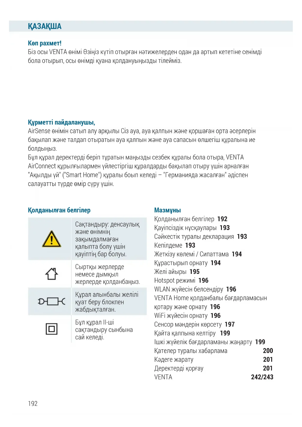 Қолданылған белгілер 192 Қауіпсіздік нұсқаулары 193 Сәйкестік туралы декларация 193 Кепілдеме 193 Жеткізу көлемі / Сипаттама 194 Құрастырып орнату 194 Желі айыры 195 Hotspot режимі 196 WLAN жүйесін белсендіру 196 VENTA Home қолданбалы бағдарламасын қотару және орнату 196 WiFi жүйесін орнату 196 Сенсор мәндерін көрсету 197 Қайта қалпына келтіру 199 Ішкі жүйелік бағдарламаны жаңарту 199 Қателер туралы хабарлама 200 Кәдеге жарату 201 Деректерді қорғау 201 VENTA 242/243ҚАЗАҚША