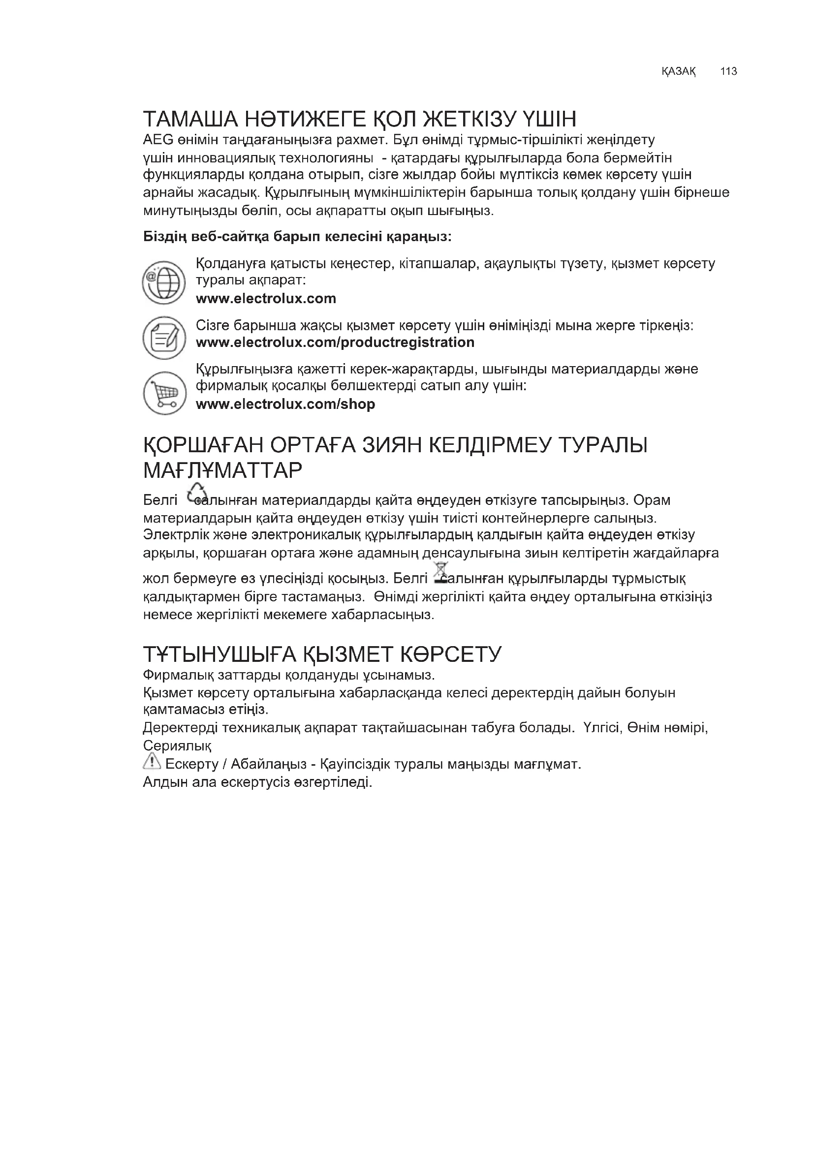 ТАМАША НӘТИЖЕГЕ ҚОЛ ЖЕТКІЗУ ҮШІН AEG өнімін таңдағаныңызға рахмет. Бұл өнімді тұрмыс-тіршілікті жеңілдету үшін инновациялық технологияны - қатардағы құрылғыларда бола бермейтін функцияларды қолдана отырып, сізге жылдар бойы мүлтіксіз көмек көрсету үшін арнайы жасадық. Құрылғының мүмкіншіліктерін барынша толық қолдану үшін бірнеше минутыңызды бөліп, осы ақпаратты оқып шығыңыз. Біздің веб-сайтқа барып келесіні қараңыз: Қолдануға қатысты кеңестер, кітапшалар, ақаулықты түзету, қызмет көрсету туралы ақпарат: www.electrolux.com Сізге барынша жақсы қызмет көрсету үшін өніміңізді мына жерге тіркеңіз: www.electrolux.com/productregistration Құрылғыңызға қажетті керек-жарақтарды, шығынды материалдарды және фирмалық қосалқы бөлшектерді сатып алу үшін: www.electrolux.com/shop ҚОРШАҒАН ОРТАҒА ЗИЯН КЕЛДІРМЕУ ТУРАЛЫ МАҒЛҰМАТТАР Белгі салынған материалдарды қайта өңдеуден өткізуге тапсырыңыз. Орам материалдарын қайта өңдеуден өткізу үшін тиісті контейнерлерге салыңыз. Электрлік және электроникалық құрылғылардың қалдығын қайта өңдеуден өткізу арқылы, қоршаған ортаға және адамның денсаулығына зиын келтіретін жағдайларға жол бермеуге өз үлесіңізді қосыңыз. Белгі салынған құрылғыларды тұрмыстық қалдықтармен бірге тастамаңыз. Өнімді жергілікті қайта өңдеу орталығына өткізіңіз немесе жергілікті мекемеге хабарласыңыз. ТҰТЫНУШЫҒА ҚЫЗМЕТ КӨРСЕТУ Фирмалық заттарды қолдануды ұсынамыз. Қызмет көрсету орталығына хабарласқанда келесі деректердің дайын болуын қамтамасыз етіңіз. Деректерді техникалық ақпарат тақтайшасынан табуға болады. Үлгісі, Өнім нөмірі,