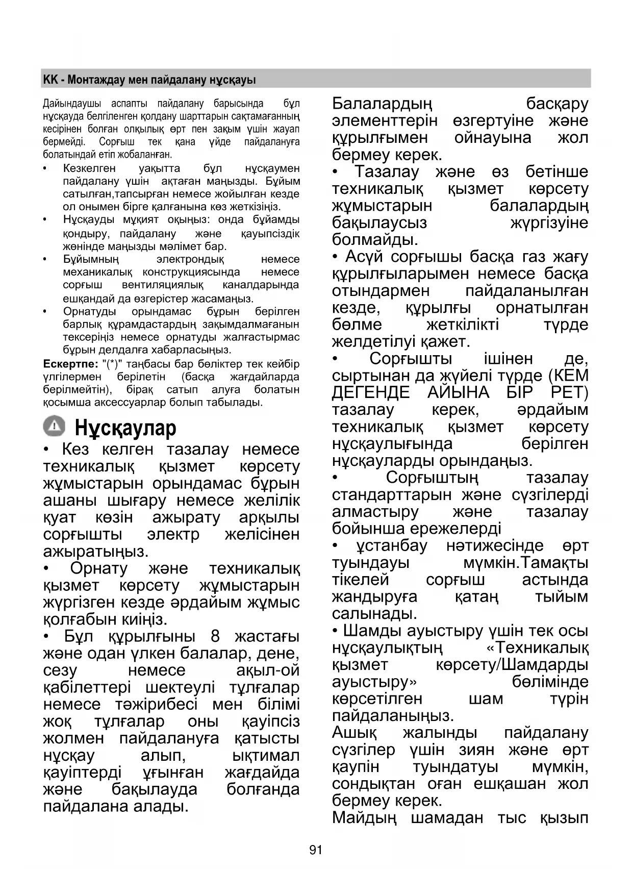 - Бұл құрылғыны 8 жастағы жəне одан үлкен балалар, дене, сезу немесе ақыл-ой қабілеттері шектеулі тұлғалар немесе тəжірибесі мен білімі жоқ тұлғалар оны қауіпсіз жолмен пайдалануға қатысты нұсқау алып, ықтимал қауіптерді ұғынған жағдайда жəне бақылауда болғанда пайдалана алады. Балалардың басқару элементтерін өзгертуіне жəне құрылғымен ойнауына жол бермеу керек.
