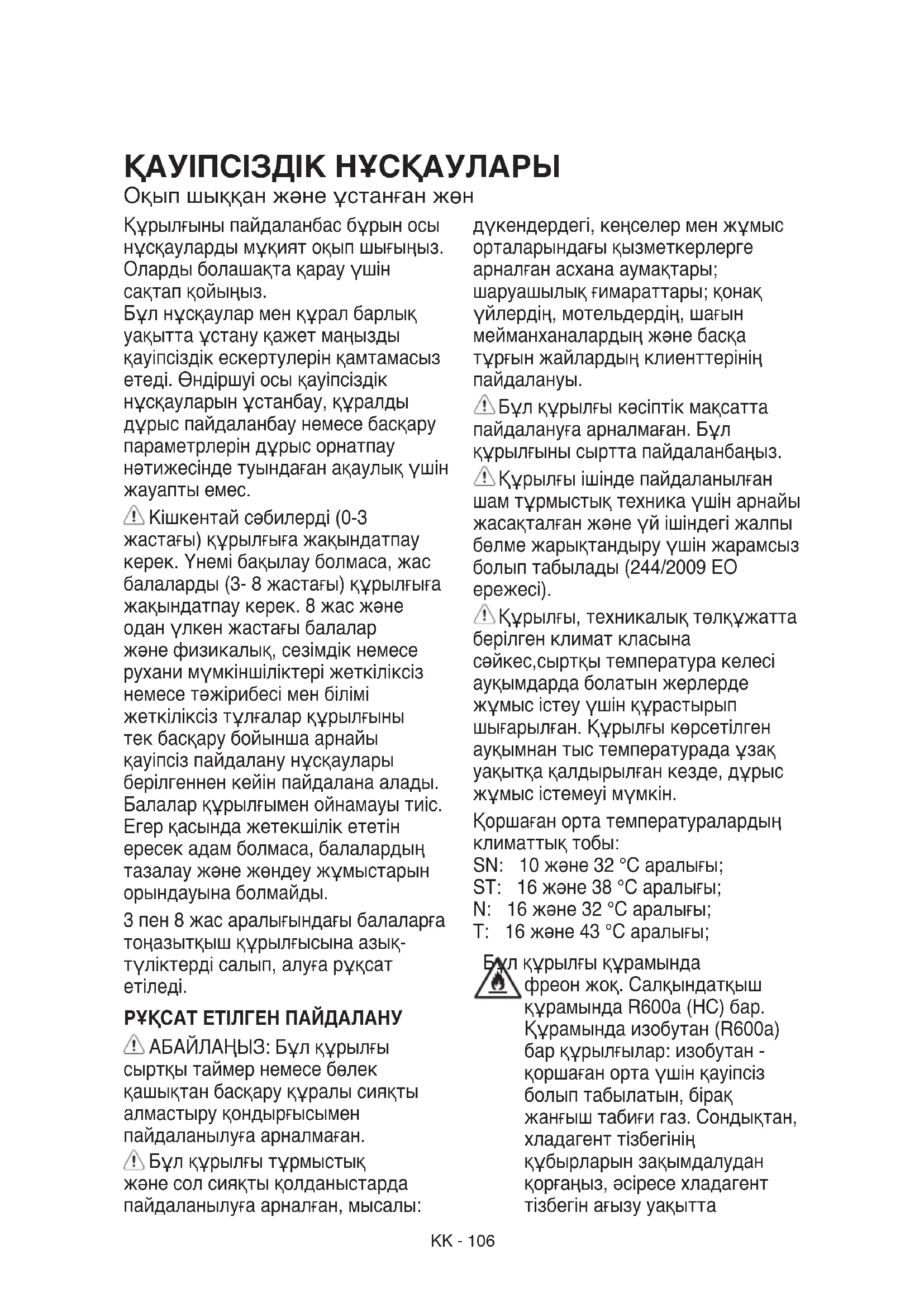 Құрылғы,техникалықтөлқұжатта берілгенклиматкласына сәйкес,сыртқытемпературакелесі ауқымдардаболатынжерлерде жұмысістеуүшінқұрастырып шығарылған.Құрылғыкөрсетілген ауқымнантыстемпературадаұзақ уақытқақалдырылғанкезде,дұрыс жұмысістемеуімүмкін. Қоршағанортатемпературалардың климаттықтобы: SN: 10және32°Cаралығы; ST: 16және38°Cаралығы; N: 16және32°Cаралығы; T: 16және43°Cаралығы; Бұлқұрылғықұрамында фреонжоқ.Салқындатқыш құрамындаR600a(HC)бар. Құрамындаизобутан(R600a) барқұрылғылар:изобутан- қоршағанортаүшінқауіпсіз болыптабылатын,бірақ жанғыштабиғигаз.Сондықтан, хладагенттізбегінің құбырларынзақымдалудан қорғаңыз,әсіресехладагент тізбегінағызууақыттаKK-107 ЕСКЕРТУ:Құрылғыдағы хладагенттізбегініңқұбырларын зақымдапалмаңыз. ЕСКЕРТУ:Құрылғыкорпусындағы немесекірістірілгенқұрылымдағы желдетусаңылауларынкедергісіз ашыққалдырыңыз. ЕСКЕРТУ:Ерітупроцесін жылдамдатуүшінөндіруші ұсынғаннанбасқамеханикалық, электрлікнехимиялыққұралдарды пайдаланбаңыз. ЕСКЕРТУ:Электрлікқұрылғылар Өндірушіарнайырұқсатбермеген түргежатса,олардыпайдаланбаңыз немесеқұрылғыбөлімдерініңішіне орналастырмаңыз. ЕСКЕРТУ:Сукөздерінетікелей қосылмағанмұздатқыштаржәне/ немесесудиспенсерлерітекауыз сументолтырылуыкерек. ЕСКЕРТУ:Автоматтымұз жасағыштардыжәне/немесесу диспенсерлерінтекауызсуберетін сукөзінежалғаукерек,ағынсу қысымы0,17және0,81мПа(1,7және 8,1бараралығындаболуыкерек). Құрылғыныңішінденемесе жанындааэрозольқауашақтары сияқтыжарылғышзаттарды сақтамаңызжәнебензиндінемесе басқадажанғышзаттардықоймаңыз немесепайдаланбаңыз. Мұзпакеттерінің(кейбір үлгілердекездеседі)ішіндегісін (уыттыемес)жұтпаңыз.Мұз текшелерінемесежемісмұзысуық күйіктерінтудыраалатындықтан, олардымұздатқыштаналғансоң бірденаузыңызғасалмаңыз. Қолжетімдіжелдеткіш қақпағыныңішіндеауасүзгісін пайдалануүшінжасақталғанөнімдер үшін,тоңазытқышжұмысістеген кездесүзгіәрқашанорнындаболуы