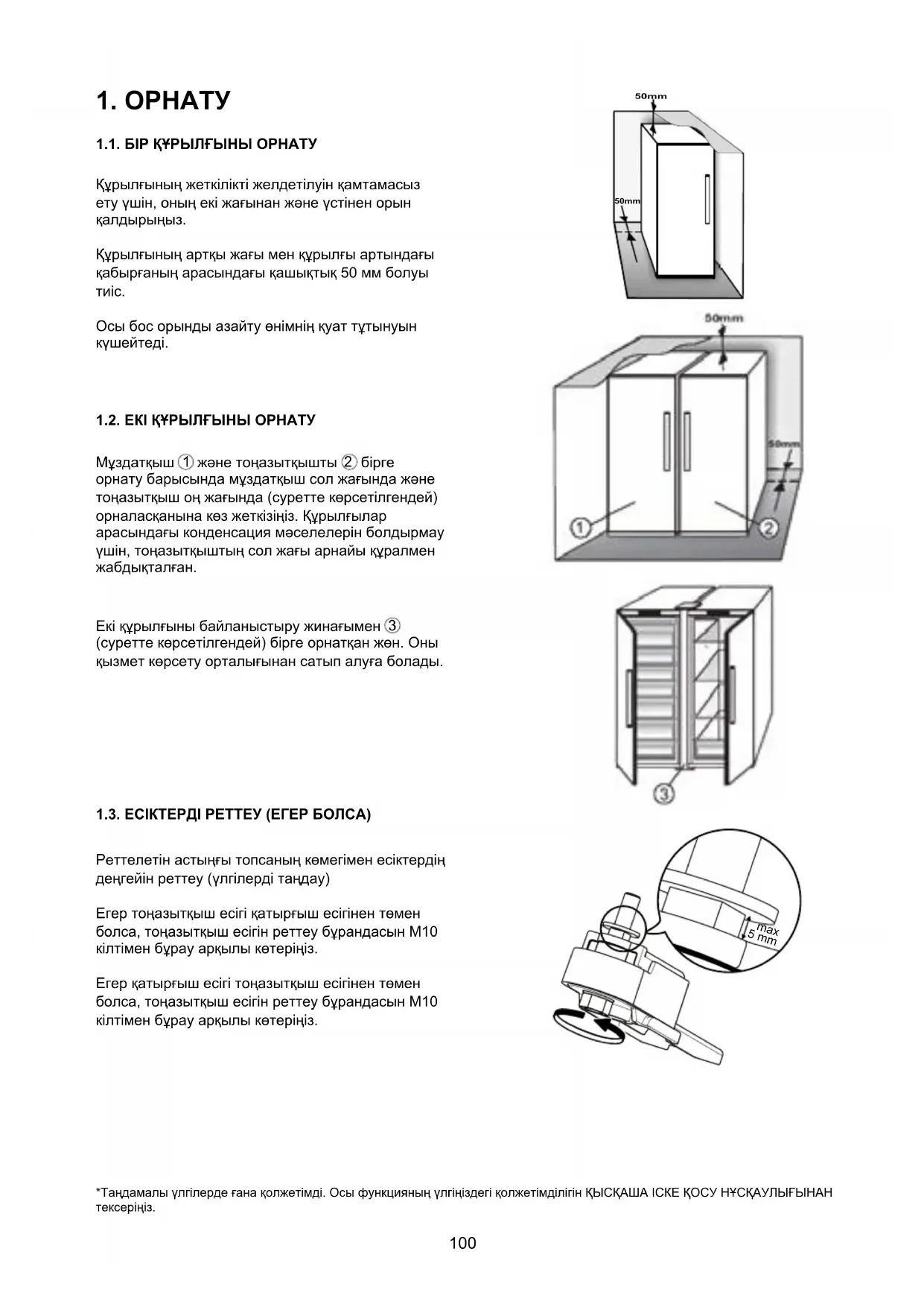(суреттекөрсетілгендей)біргеорнатқанжөн.Оны қызметкөрсетуорталығынансатыпалуғаболады. 1.3. ЕСІКТЕРДІ РЕТТЕУ (ЕГЕР БОЛСА) Реттелетінастыңғытопсаныңкөмегіменесіктердің деңгейінреттеу(үлгілердітаңдау) Егертоңазытқышесігіқатырғышесігінентөмен болса,тоңазытқышесігінреттеубұрандасынМ10 кілтіменбұрауарқылыкөтеріңіз. Егерқатырғышесігітоңазытқышесігінентөмен болса,тоңазытқышесігінреттеубұрандасынМ10 кілтіменбұрауарқылыкөтеріңіз. *Таңдамалыүлгілердеғанақолжетімді.ОсыфункцияныңүлгіңіздегіқолжетімділігінҚЫСҚАШАІСКЕҚОСУНҰСҚАУЛЫҒЫНАН тексеріңіз. 50mm 50mm 5 mm max101