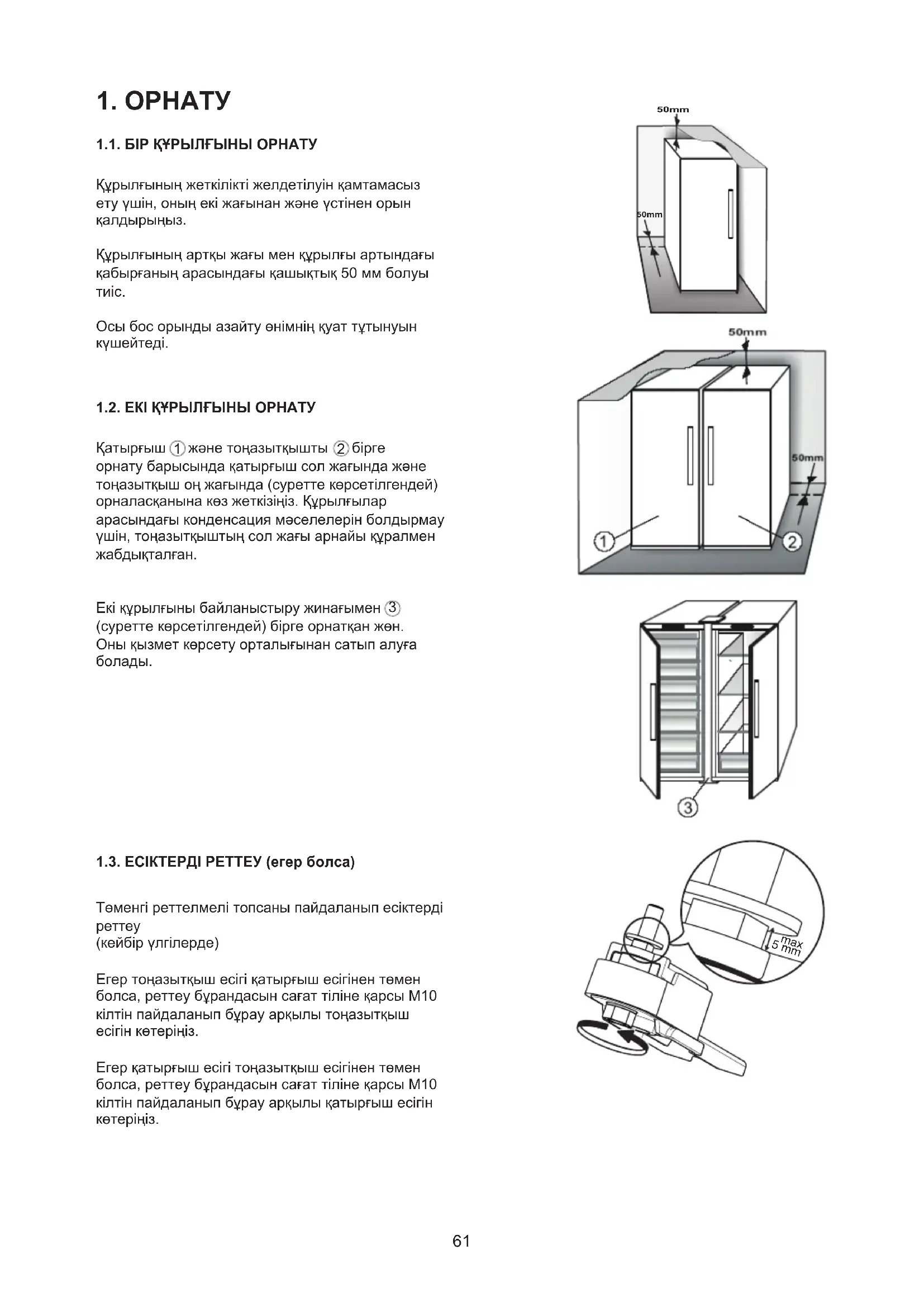 1.1. БІР ҚҰРЫЛҒЫНЫ ОРНАТУ Құрылғыныңжеткіліктіжелдетілуінқамтамасыз етуүшін,оныңекіжағынанжәнеүстіненорын қалдырыңыз. Құрылғыныңартқыжағыменқұрылғыартындағы қабырғаныңарасындағықашықтық50ммболуы