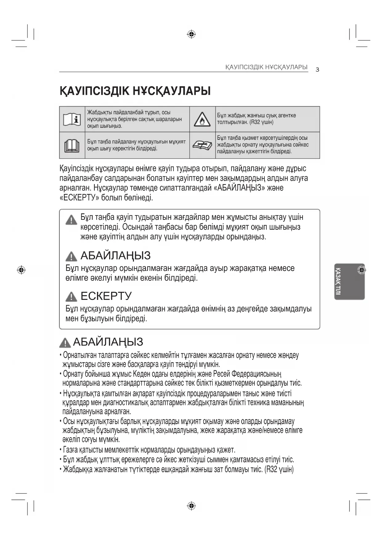 Жабдықты пайдаланбай тұрып, осы нұсқаулықта берілген сақтық шараларын оқып шығыңыз. Бұл жабдық жанғыш суық агентке толтырылған. (R32 үшін) Бұл таңба пайдалану нұсқаулығын мұқият оқып шығу керектігін білдіреді. Бұл таңба қызмет көрсетушілердің осы жабдықты орнату нұсқаулығына сәйкес пайдалануы қажеттігін білдіреді.