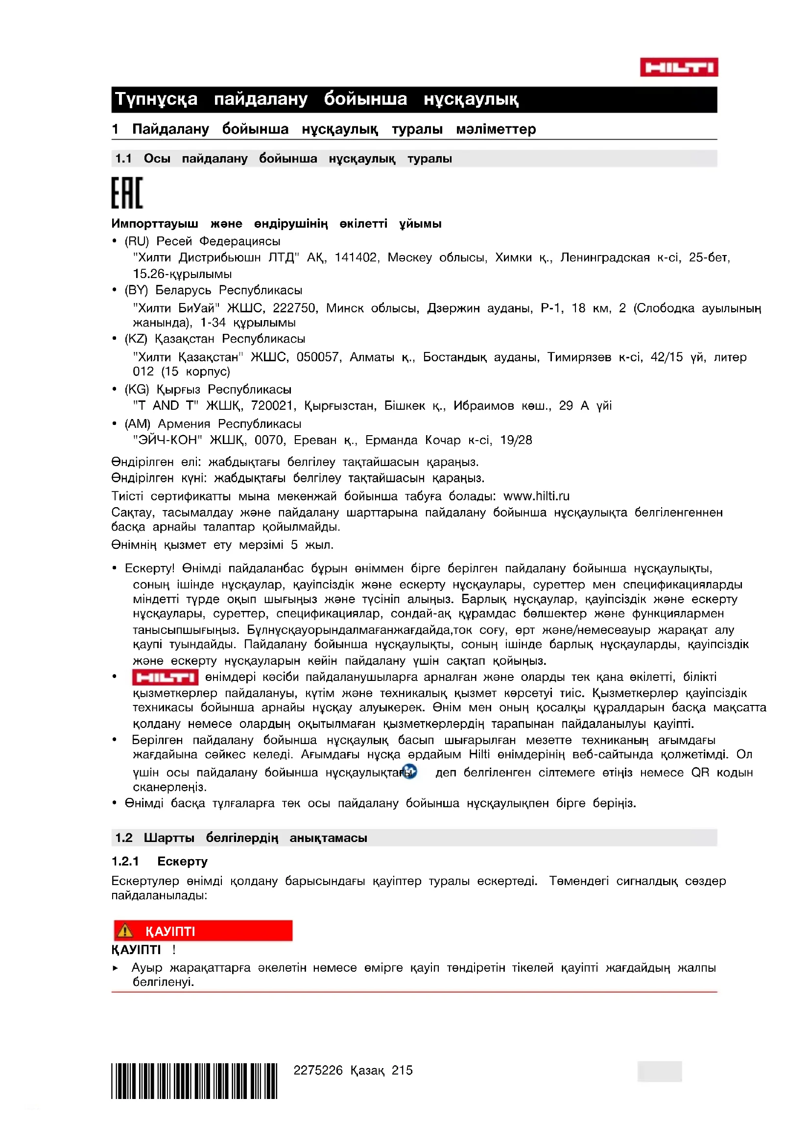 - (AM) Армения Республикасы "ЭЙЧ-КОН" ЖШҚ, 0070, Ереван қ., Ерманда Кочар к-сі, 19/28 Өндірілген елі: жабдықтағы белгілеу тақтайшасын қараңыз. Өндірілген күні: жабдықтағы белгілеу тақтайшасын қараңыз. Тиісті сертификатты мына мекенжай бойынша табуға болады: www.hilti.ru Сақтау, тасымалдау және пайдалану шарттарына пайдалану бойынша нұсқаулықта белгіленгеннен басқа арнайы талаптар қойылмайды. Өнімнің қызмет ету мерзімі 5 жыл.