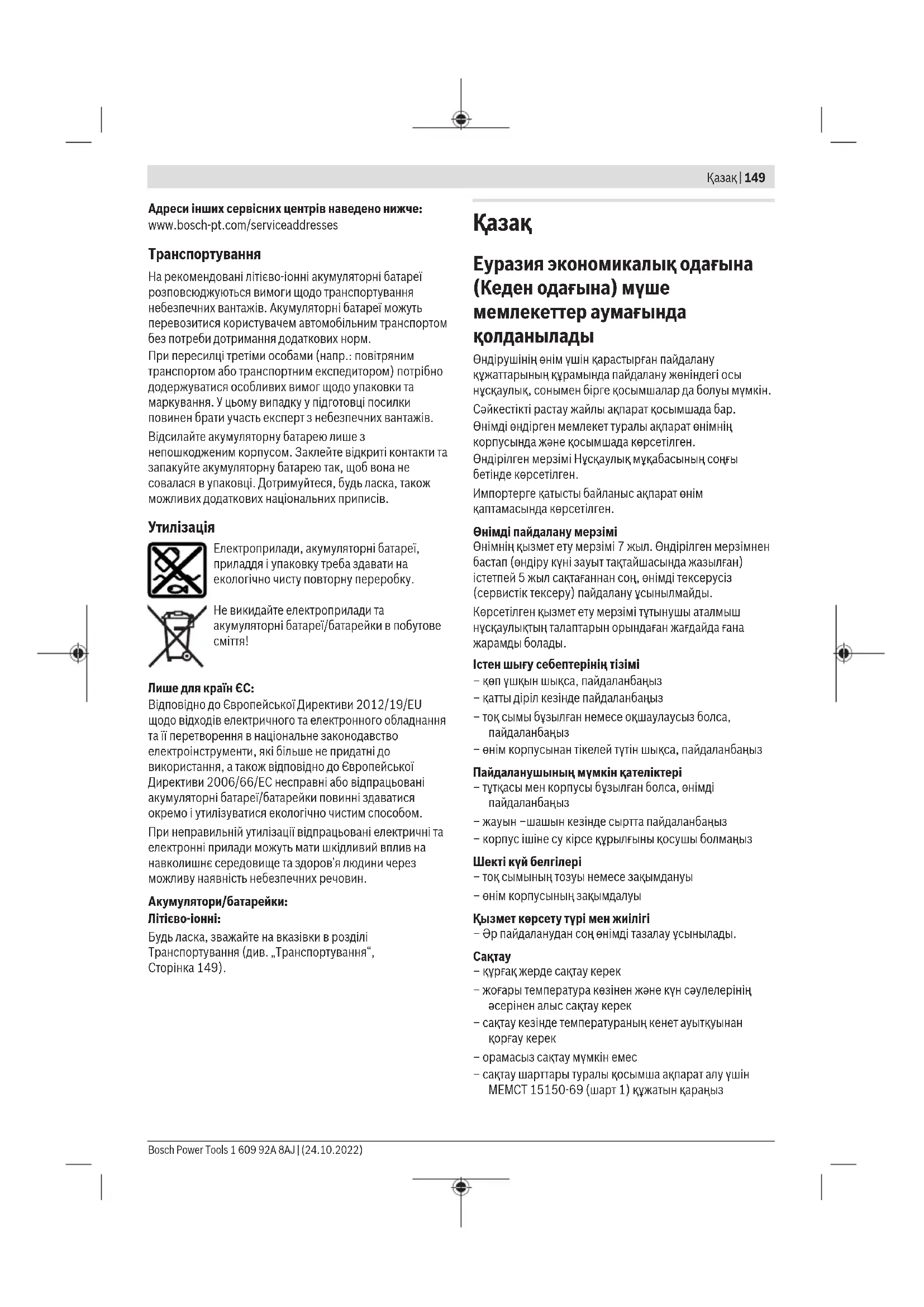 u Қолтұтқалар мен қармау беттерін құрғақ, таза және май мен ластан таза ұстаңыз. Сырғанақ қолтұтқалар мен қармау беттері күтілмеген жағдайларда сенімді қолдану мен бақылауға жол бермейді. Батарея құралын пайдалану және күту u Тек өндіруші сипаттаған зарядтағышмен қайта зарядтаңыз. Батарея жинағының бір түріне сай зарядтағыш басқа батарея жинағымен қолдануда өрт қауіпіне адып келуі мүмкін. u Электр құралдарын тек арнайы тағайындалған батарея жинақтарымен пайдаланыңыз. Кез келген басқа батарея жинақтарын пайдалану жарақаттану мен өрт қауіпіне алып келеді. u Егер батарея жинағы қолдануда болмаса, оны түйреуіш, тиын, кілт, шеге, бұранда немесе басқа кіші метал заттардан ұстаңыз, олар бір терминалдан басқасына байланыс жасауы мүмкін. Батарея терминалдарын қосу күйік немесе өртке алып келуі мүмкін. u Дұрыс емес пайдалануда батареядан сұйықтық ағуы мүмкін, оған тимеңіз. Егер тиіп қалсаңыз, сумен шайып тастаңыз. Егер сұйықтық көзге тисе дәрігерге хабарласыңыз. Батареядан шаққан сұйықтық қозу немесе күйіктерге алып келуі мүмкін. u Зақымдалған немесе өзгертілген батарея жинақтарын пайдаланбаңыз. Зақымдалған немесе өзгертілген батареялар өртке, жарылуға немесе жарақаттуға алып келуі мүмкін кездейсоқ әрекеттерге алып келуі мүмкін. u Батарея жинағын немесе құралын өртке немесе қатты температураға салдырмаңыз. 130°C жоғары температураларда жарылыс болуы мүмкін. u Барлық зарядтау нұсқауларын орындап батарея жинағын нұсқауларда белгіленген температура ауқымынан тыс жағдайда зарядтамаңыз. Дұрыс емес зарядтау немесе белгіленген ауқымнан тыс температурада зарядтау батареяны зақымдап өрт қауіпін жоғарылатуы мүмкін. Bosch Power Tools 1 609 92A 8AJ | (24.10.2022)152 | Қазақ Қызмет көрсету u Электр құралына маманды жөндеуші тек бірдей қосалқы бөлшектермен қызмет көрсетуі керек. Бұл электр құралының қауіпсіздігін сақталуын қамтамасыз