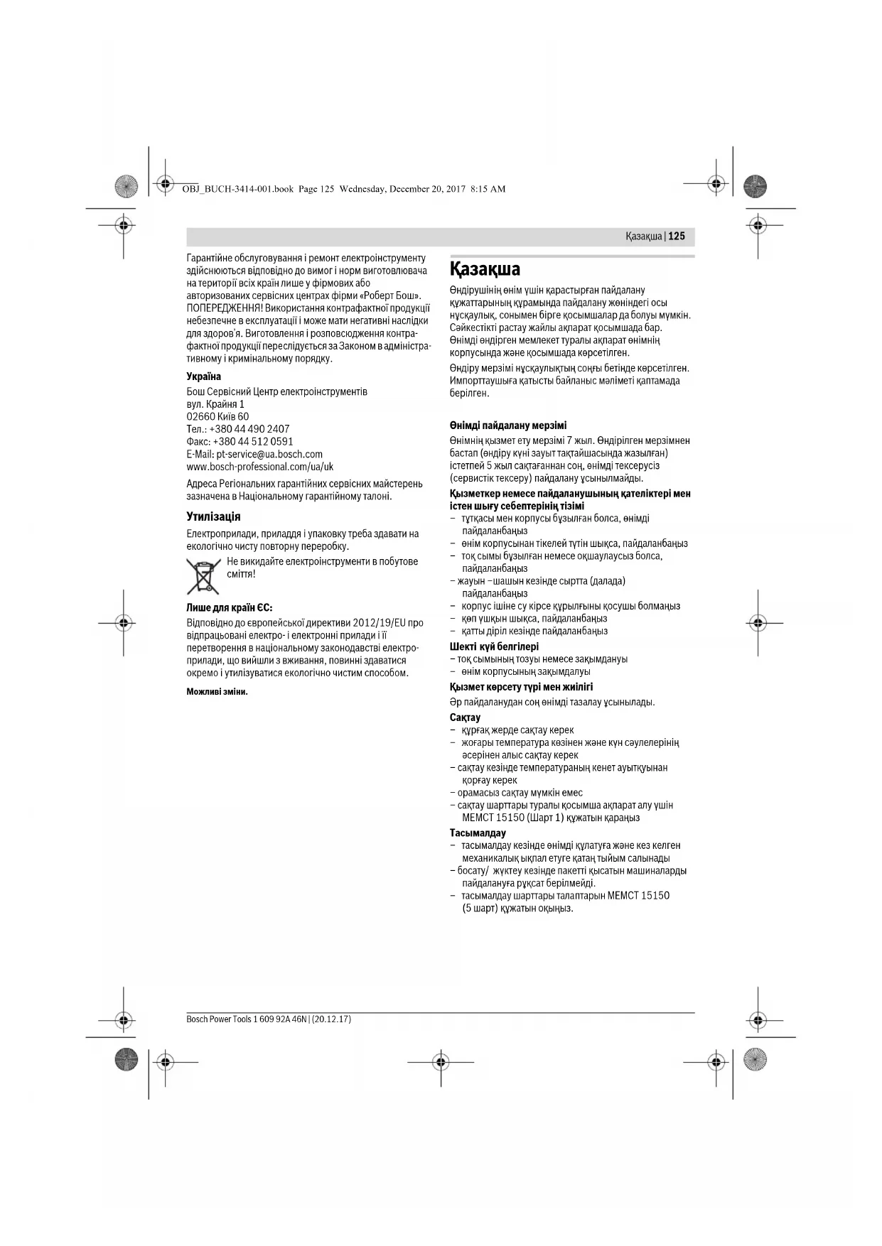 жүктеу кезінде пакетті қысатын машиналарды пайдалануға рұқсат берілмейді. – тасымалдау шарттары талаптарын МЕМСТ 15150 (5 шарт) құжатын оқыңыз. OBJ_BUCH-3414-001.book Page 125 Wednesday, December 20, 2017 8:15 AM126 | Қaзақша 1 609 92A 46N | (20.12.17) Bosch Power Tools Қауіпсіздік нұсқаулары Электр құралдарының жалпы қауіпсіздік нұсқаулықтары Барлық қауіпсіздік нұсқаулықтарын және ескертпелерді оқыңыз. Техни- калық қауіпсіздік нұсқаулықтарын және ескертпелерді сақтамау тоқтың соғуына, өрт және/немесе ауыр жарақаттануларға алып келуі мүмкін. Болашақ жұмыстар үшін қауіпсіздік нұсқаулықтары мен ескертпелерді сақтап қойыңыз. Қауіпсіздік нұсқаулықтарында пайдаланылған “Электр құрал” атауының желіден қуат алатын электр құралдарына (желілік кабелі менен) және аккумуляторден қуат алатын электр құралдарына (желілік кабелі жоқ) қатысы бар. Жұмыс орнының қауіпсіздігі Жұмыс орнын таза және жақсы жарықталған жағдайда ұстаңыз. Тәртіп немесе жарық болмаған жұмыс аймақтары жазатайым оқиғаларға алып келуі