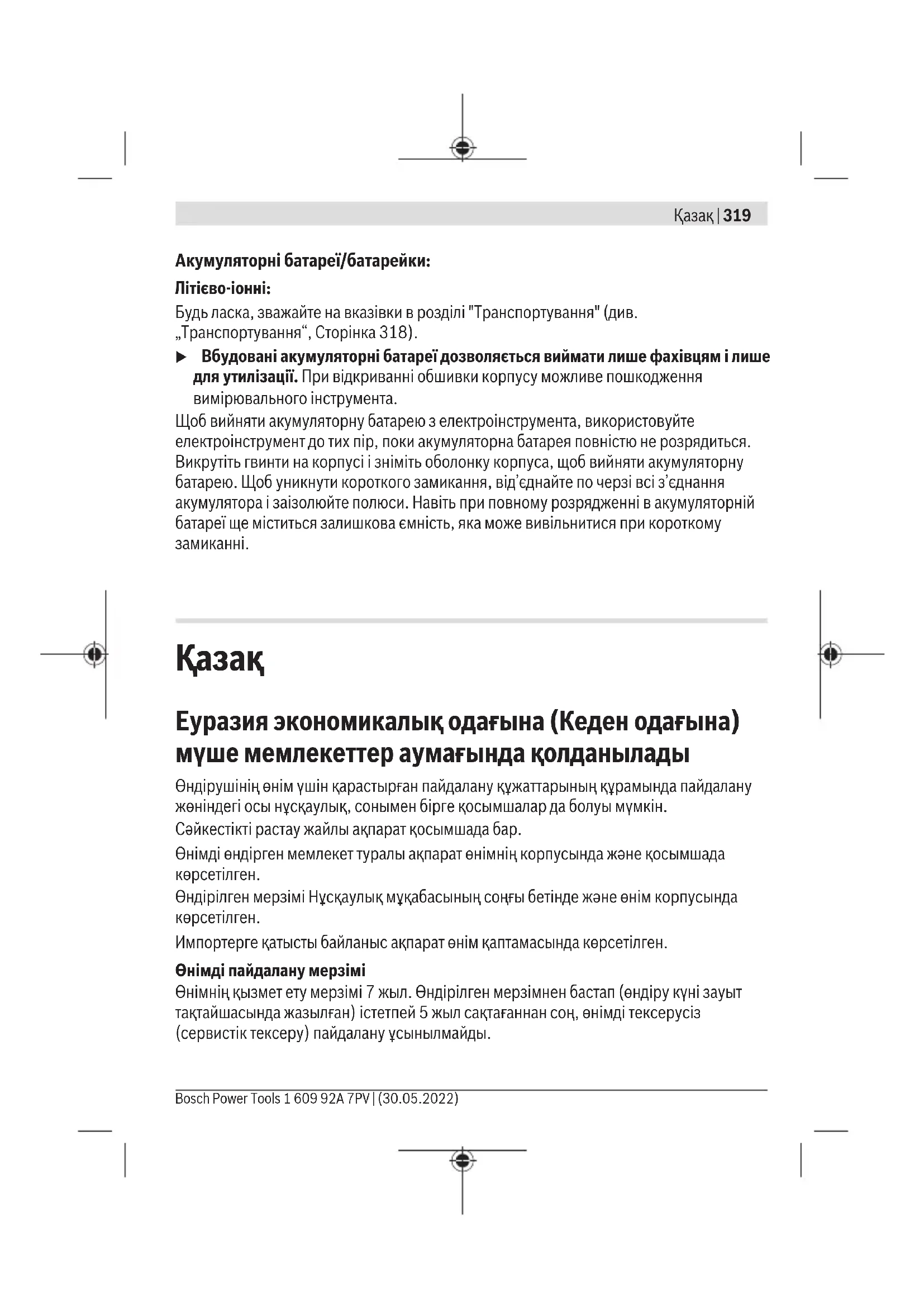 Бұл литий-иондық аккумуляторлар қауіпті тауарларға қойылатын талаптарға сай болуы керек. Пайдаланушы аккумуляторларды көшеде қосымша құжаттарсыз тасымалдай алады. Үшінші тұлғалар (мысалы, әуе көлігі немесе жіберу) орамаға және маркаларға қойылатын арнайы талаптарды сақтау керек. Жіберуге дайындау кезінде қауіпті жүктерді тасымалдау маманымен хабарласу керек. Кәдеге жарату Өлшеу құралдарын, зарядтағыш құрылғыларды, аккумуляторларды, керек- жарақтар мен орауыштарды қоршаған орта үшін қауіпсіз жолмен кәдеге жарату орнына тапсыру қажет. Bosch Power Tools 1 609 92A 7PV | (30.05.2022)336 | Қазақ Өлшеу құралдарын, зарядтағыш құрылғылар мен аккумуляторларды тұрмыстық қоқысқа тастамаңыз! Тек қана ЕО елдері үшін: Ескі электрлік және электрондық құрылғылар туралы 2012/19/EU еуропалық директивасы және оның ұлттық заңнамада қолданылуы бойынша пайдалануға бұдан былай жарамсыз өлшеу құралдары мен зарядтағыш құрылғыларды және 2006/66/ ЕC еуропалық директивасы бойынша зақымдалған немесе ескірген аккумуляторларды/батареяларды бөлек жинап, қоршаған орта үшін қауіпсіз жолмен қайта өңдеуге жіберу қажет. Қате жолмен кәдеге жаратылған ескі электрлік және электрондық құрылғылар қауіпті заттардың болу мүмкіндігіне байланысты қоршаған ортаға және адам денсаулығына зиянды әсер тигізуі мүмкін. Аккумуляторлар/батареялар: Литий-ионық: Тасымалдау бөліміндегі, бетіндегі нұсқауларды орындаңыз (қараңыз „Тасымалдау“, Бет335) сенсорлық пернемен растаңыз. u Кіріктірілген аккумуляторларды кәдеге жарату мақсатында техник мамандар ғана шығара алады. Корпус қаптамасын ашу нәтижесінде өлшегіш құрал бұзылуы