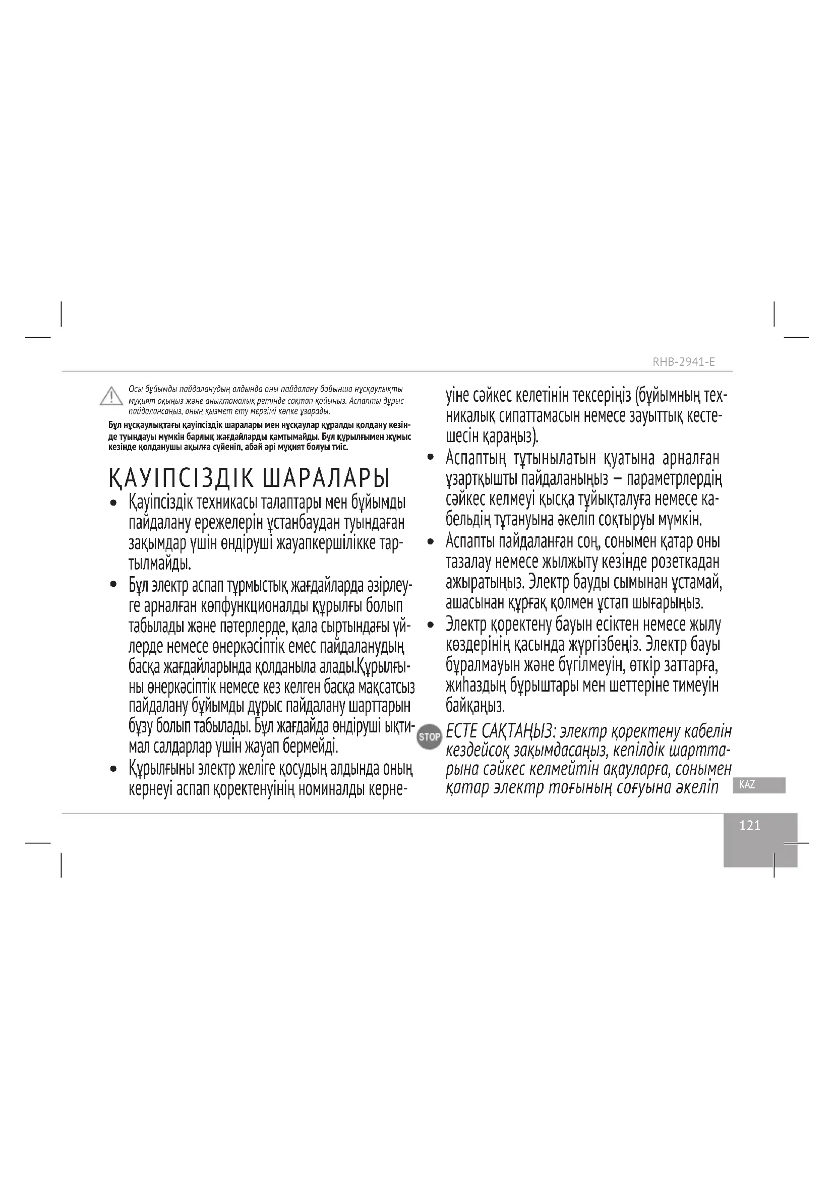 кестеден қараңыз (7 бет). Аспапты тазалау кезінде тағаммен байланысқа түсетін заттарды қолдану үшін ұсынылмаған қырғыш құралдарды, химиялық агрессивті немесе өзге зат- тарды қолданбаңыз. Пышақтар мен алмастарын тазалау кезінде абай болыңыз— олар өте өткір! Сақтау және тасымалдау Сақтау және қайта пайдаланудың алдында құралдың барлық бөліктерін тазалап, түгел құрғатыңыз. Құралды құрғақ желденетін жерде жылыту аспаптарынан алыс және тікелей күн сәулелерден алыс сақтаңыз.RHB-2941-E