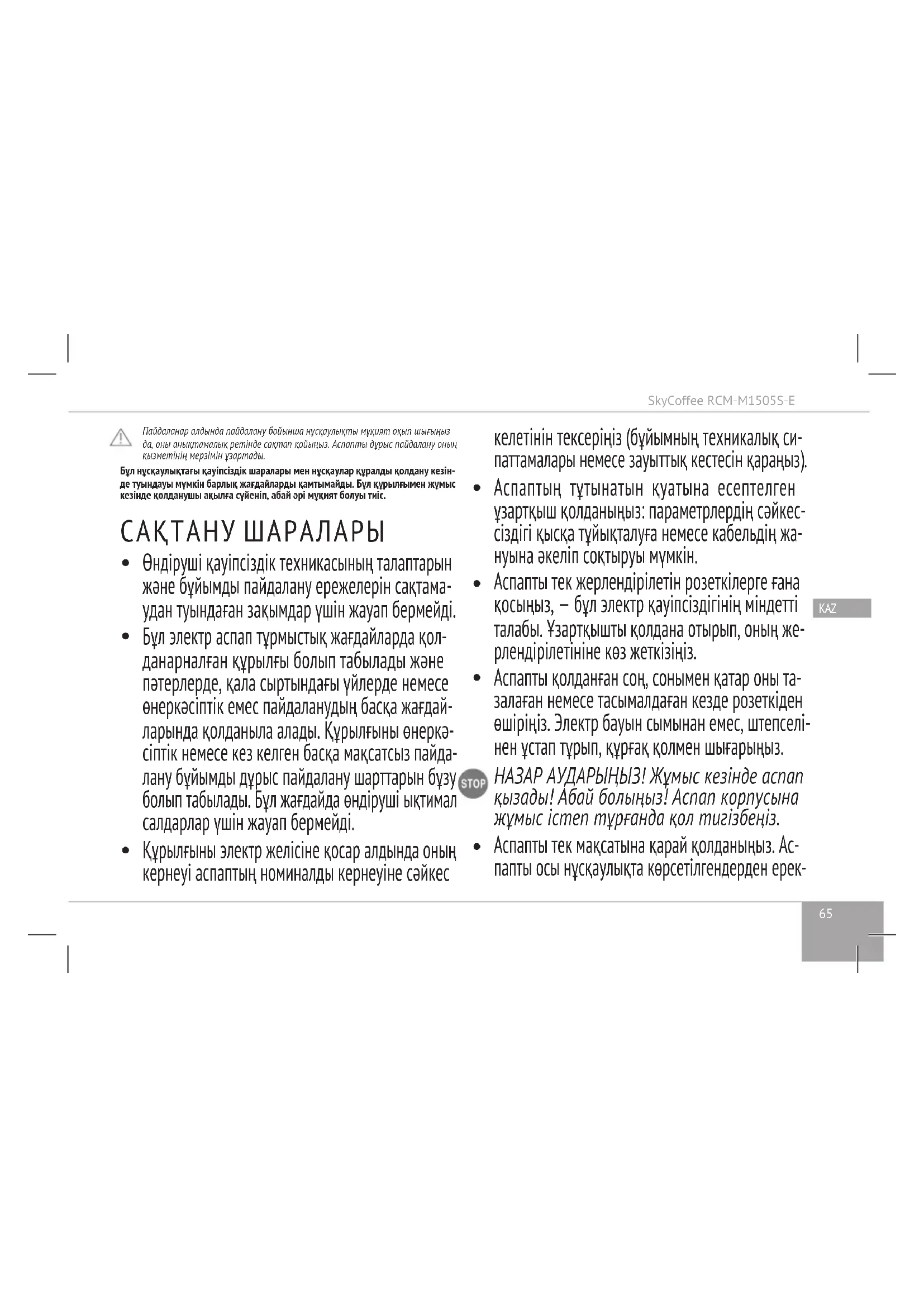 8 және одан үлкен жастағы балаларға, сонымен қатар физикалық, сенсорлық немесе ой шектеу- лері бар немесе тәжірибе не білім жетіспеушілік- тері бар тұлғаларға құралды тек қараумен және/ немесе егер олар құралды қауіпсіз пайдалануға қатысты нұсқау алып, оны пайдаланумен байла- нысты қауіпті сезсе ғана қолдануға болады. Ба- лаларға құралмен ойнауға болмайды. Құрал мен оның электр желісі сымын 8 жастан кіші балалар үшін қол жетімсіз жерде ұстаңыз. Құрылғыны тазалау мен оған қызмет көрсету ересектердің қарауысыз балалармен іске асырылмауы қажет.SkyCoffee RCM-M1505S-E