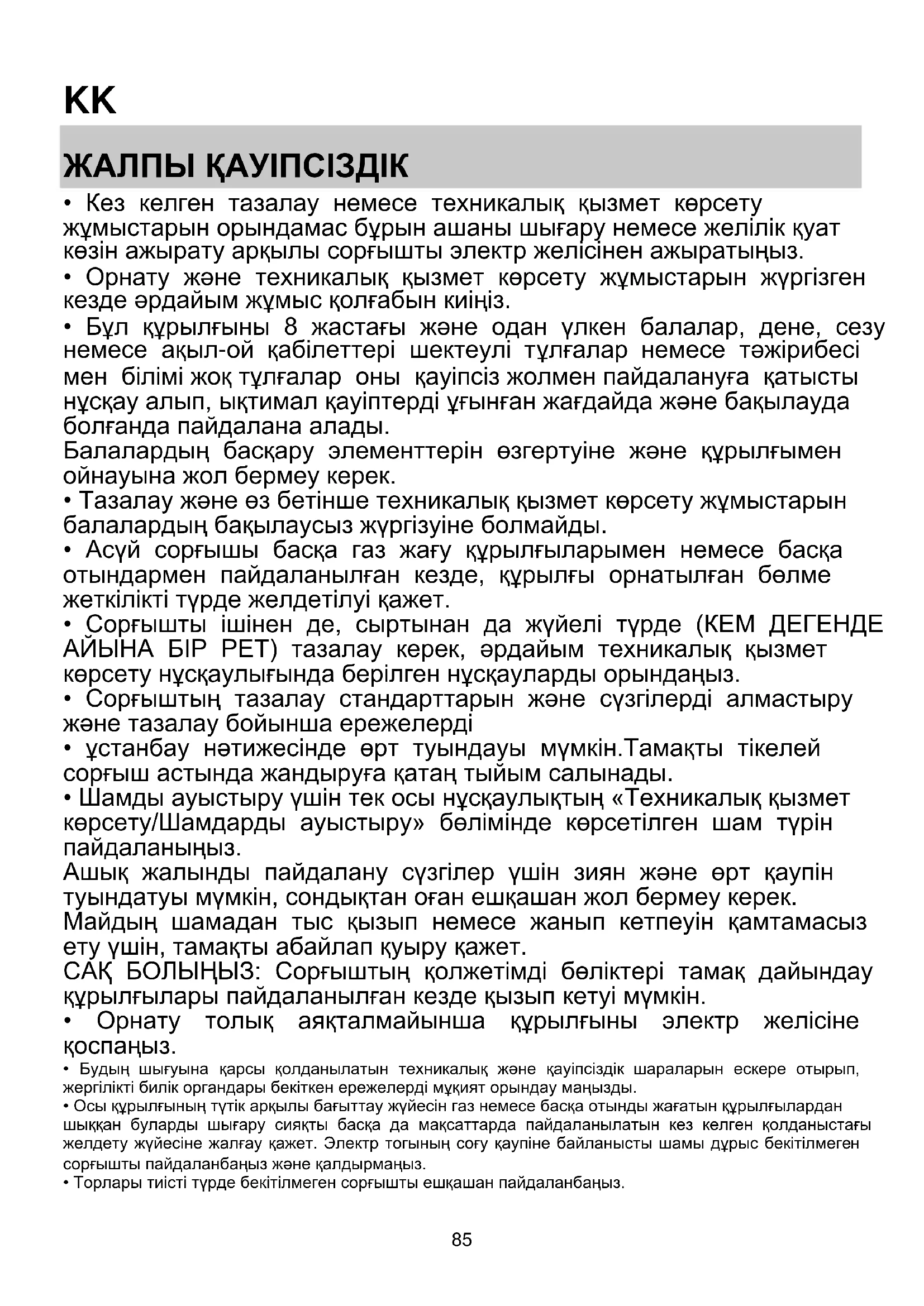 - Бұл құрылғыны 8 жастағы және одан үлкен балалар, дене, сезу немесе ақыл-ой қабілеттері шектеулі тұлғалар немесе тәжірибесі мен білімі жоқ тұлғалар оны қауіпсіз жолмен пайдалануға қатысты нұсқау алып, ықтимал қауіптерді ұғынған жағдайда және бақылауда болғанда пайдалана алады. Балалардың басқару элементтерін өзгертуіне және құрылғымен ойнауына жол бермеу керек.
