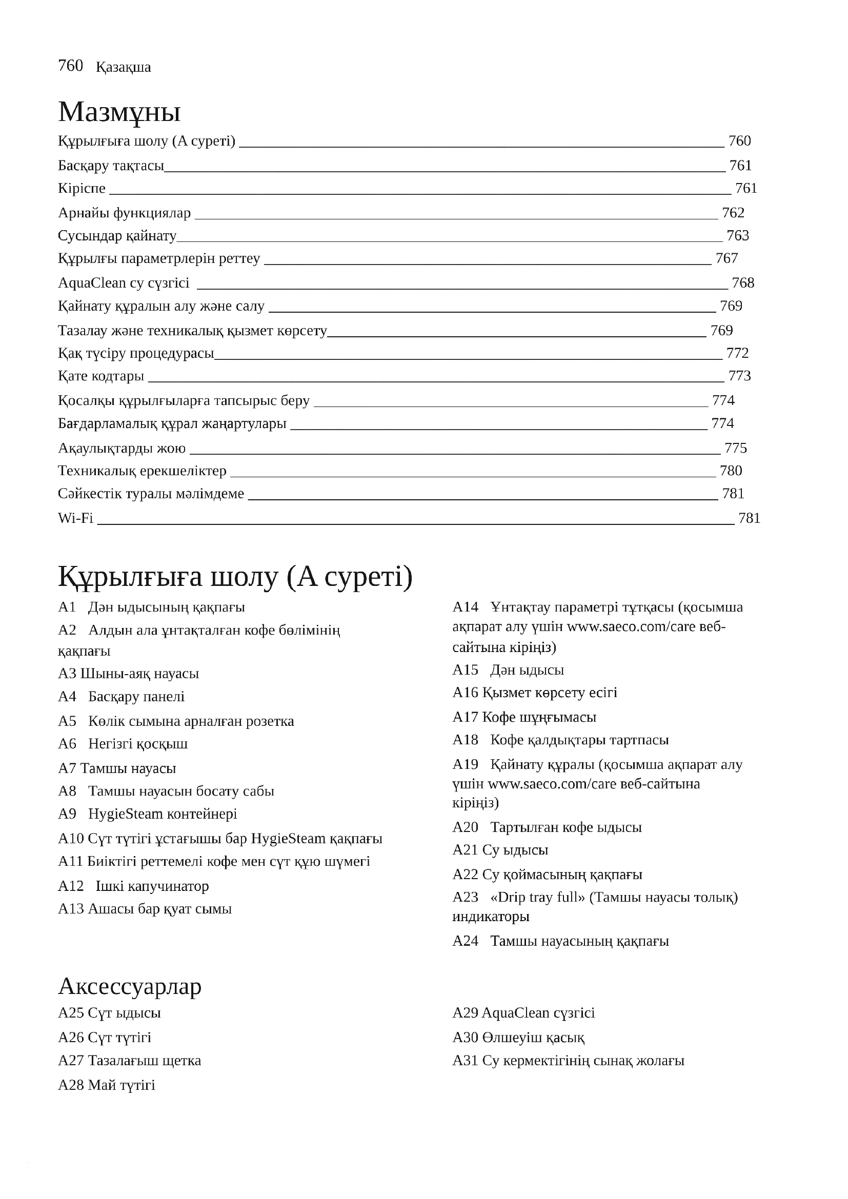Құрылғыға шолу (A суреті) ________________________________________________________________ 760 Басқару тақтасы__________________________________________________________________________ 761 Кіріспе __________________________________________________________________________________ 761 Арнайы функциялар _____________________________________________________________________ 762 Сусындар қайнату________________________________________________________________________ 763 Құрылғы параметрлерін реттеу ___________________________________________________________ 767 AquaClean су сүзгісі ______________________________________________________________________ 768 Қайнату құралын алу және салу ___________________________________________________________ 769 Тазалау және техникалық қызмет көрсету__________________________________________________ 769 Қақ түсіру процедурасы___________________________________________________________________ 772 Қате кодтары ____________________________________________________________________________ 773 Қосалқы құрылғыларға тапсырыс беру ____________________________________________________ 774 Бағдарламалық құрал жаңартулары _______________________________________________________ 774 Ақаулықтарды жою ______________________________________________________________________ 775 Техникалық ерекшеліктер ________________________________________________________________ 780 Сәйкестік туралы мәлімдеме ______________________________________________________________ 781 Wi-Fi ____________________________________________________________________________________ 781 Құрылғыға шолу (A суреті) A1Дән ыдысының қақпағы A2Алдын ала ұнтақталған кофе бөлімінің