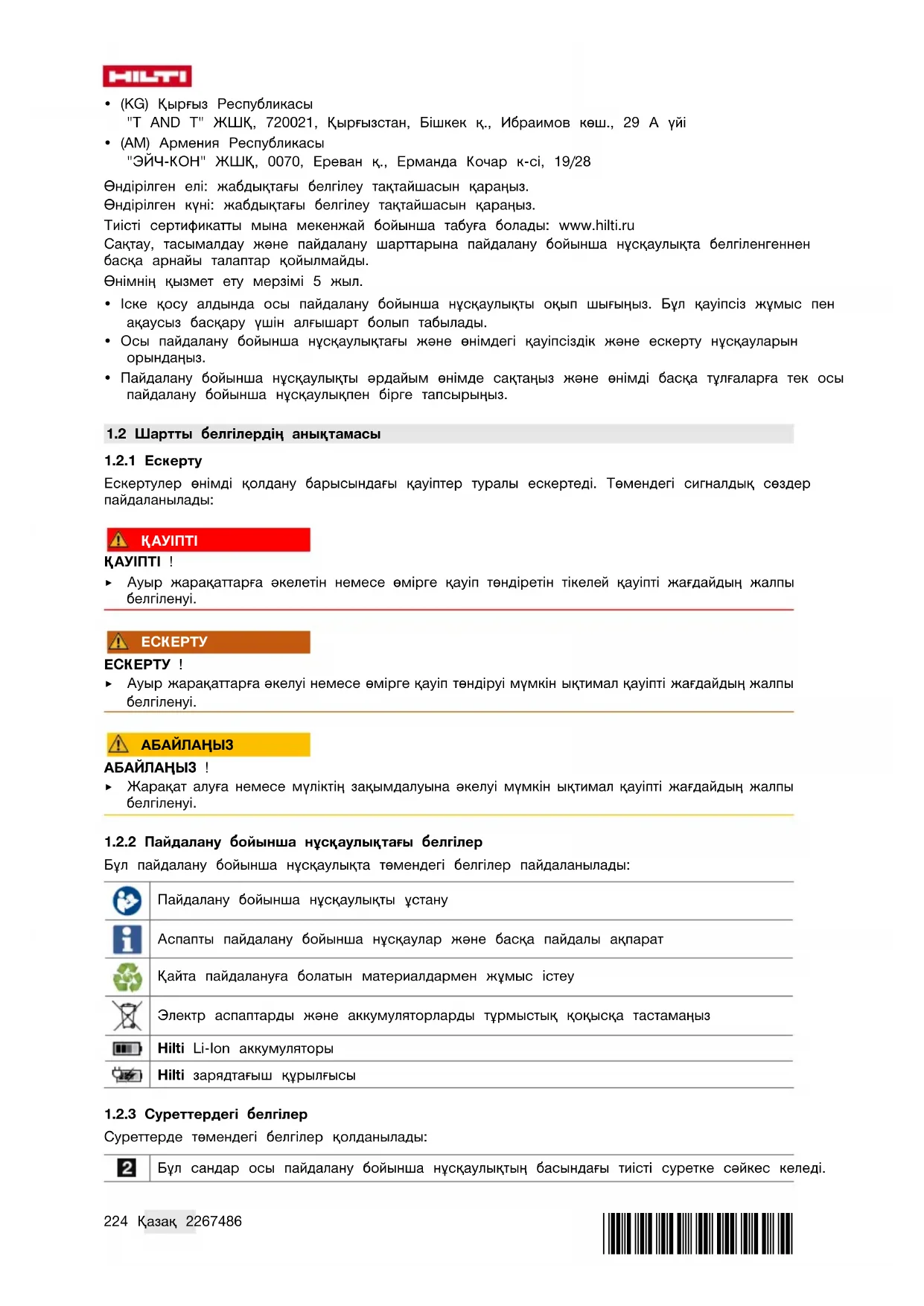 Бұл пайдалану бойынша нұсқаулықта төмендегі белгілер пайдаланылады: Пайдалану бойынша нұсқаулықты ұстану Аспапты пайдалану бойынша нұсқаулар және басқа пайдалы ақпарат Қайта пайдалануға болатын материалдармен жұмыс істеу Электр аспаптарды және аккумуляторларды тұрмыстық қоқысқа тастамаңыз Hilti LiIon аккумуляторы Hilti зарядтағыш құрылғысы