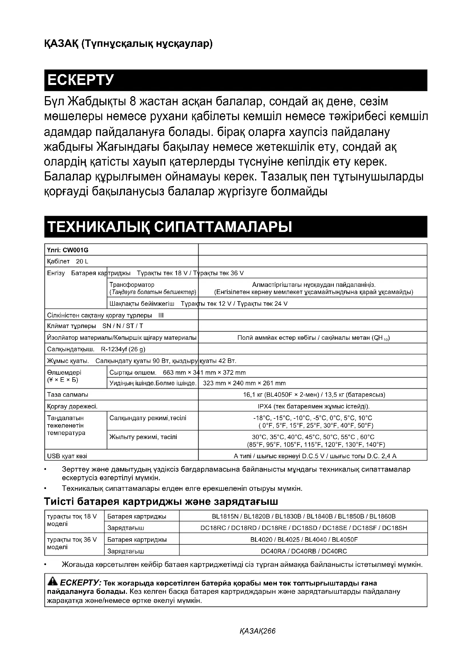 БүлЖабдықты8жастанасқанбалалар,сондайақдене,сезім мөшелерынемесеруханиқабілетыкемшілнемесетәжірибесікемшіл адамдарпайдалануғаболады.бірақоларғахаупсізпайдалану жабдығыЖағындағыбақылаунемесежетекшілікету,сондайақ олардіңқатістыхауыпқатерлердытүснуінекепілдікетукерек. Балаларқұрылғыменойнамауыкерек.Тазалықпентұтынушыларды қорғаудібақыланусызбалаларжүргізугеболмайды ТЕХНИКАЛЫҚ СИПАТТАМАЛАРЫ Үлгі: CW001GҚабілет 20 LЕнгізу Батареякартриджы Түрақтытөк18V/Түрақтытөк36VТрансформатор Таңдауға болатын бөлшектер Алмастірғіштағынұсқауданпайдаланіңіз.(Енгізілетенкернеумемлекетұқсамайтындғынақарайұқсамайды)Шақпақтыбейімжегіш Түрақтытөк12V/Түрақтытөк24VСілкіністенсақтануқорғаутұрлеры IIIКлйматтұрлеры SN / N / ST / TЙзолйаторматериалы/КөпыршікщіғаруматериалыПолйаммйакестеркөбігы/сақйналыметан(C