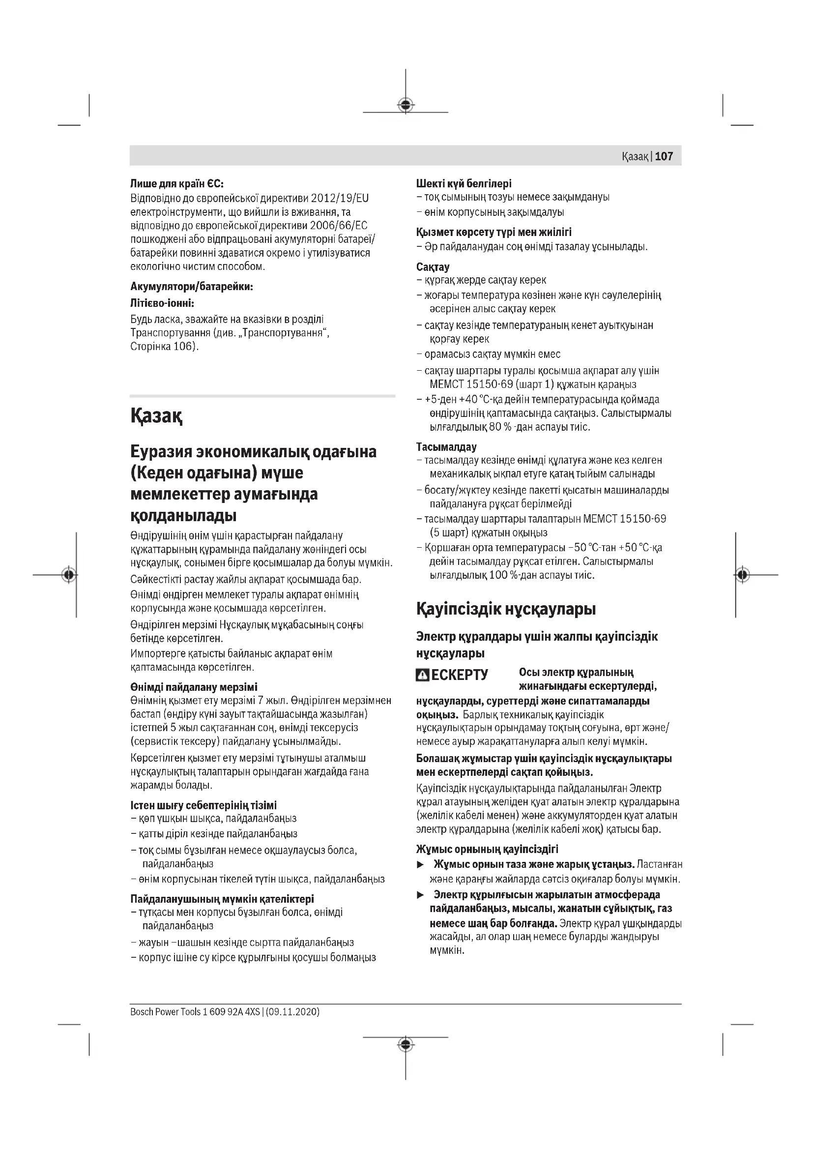Bosch Power Tools 1 609 92A 4XS | (09.11.2020)108 | Қазақ u Балалар мен бақылаушыларды электр құралынан алыс ұстаңыз. Алданулар бақылау жоғалуына алып келуі мүмкін. u Жабдық тұрмыстық жағдайларда, коммерциялық аймақтарда және қоғамдық жерлерде, зиянды және қауіпті өндірістік факторлар жоқ кіші электр тұтынуы бар өндірістік аймақтарында жұмыс істеу үшін