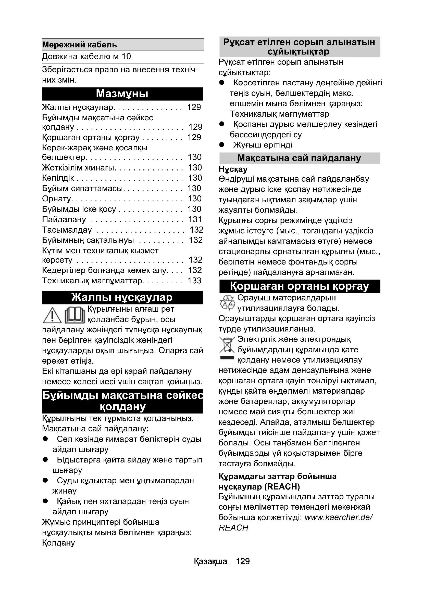 - Өндіруші мақсатына сай пайдаланбау жəне дұрыс іске қоспау нəтижесінде туындаған ықтимал зақымдар үшін жауапты болмайды. Құрылғы сорғы режимінде үздіксіз жұмыс істеуге (мыс., тоғандағы үздіксіз айналымды қамтамасыз етуге) немесе стационарлы орнатылған құрылғы (мыс., берілетін немесе фонтандық сорғы ретінде) пайдалануға арналмаған. Қоршаған ортаны қорғау Орауыш материалдарын утилизациялауға болады. Орауыштарды қоршаған ортаға қауіпсіз түрде утилизациялаңыз. Электрлік жəне электрондық бұйымдардың құрамында қате қолдану немесе утилизациялау нəтижесінде адам денсаулығына жəне қоршаған ортаға қауіп төндіруі ықтимал, құнды қайта өңделмелі материалдар жəне батареялар, аккумуляторлар немесе май сияқты бөлшектер жиі кездеседі. Алайда, аталмыш бөлшектер бұйымды тиісінше пайдалану үшін қажет болады. Осы таңбамен белгіленген бұйымдарды үй қоқыстарымен бірге тастауға болмайды. Құрамдағы заттар бойынша нұсқаулар (REACH) Бұйымның құрамындағы заттар туралы соңғы мəліметтер төмендегі мекенжай бойынша қолжетімді: www.kaercher.de/ REACH Мережний кабель Довжина кабелю м 10 Жалпы нұсқаулар p. 129