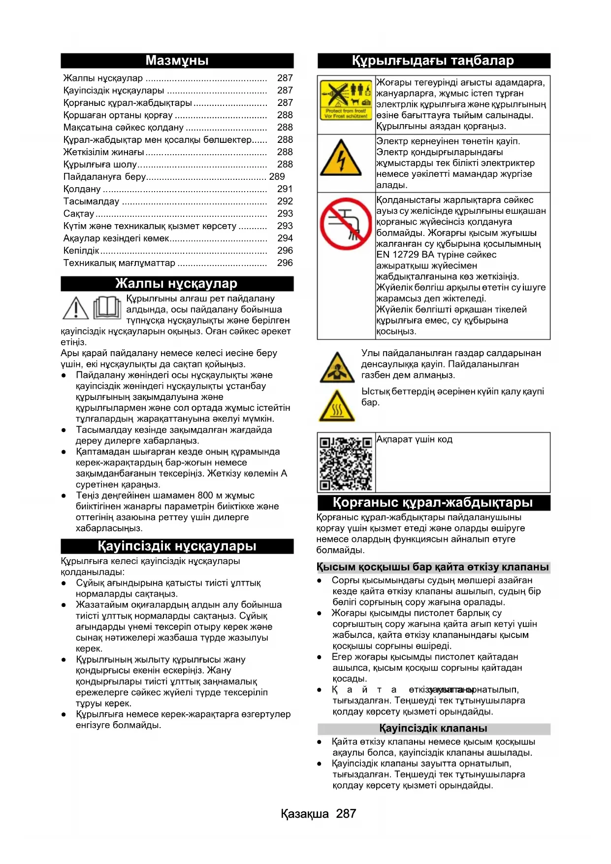 - Tехникалық мағлұматтар Жоғары тегеурінді ағысты адамдарға, жануарларға, жұмыс істеп тұрған электрлік құрылғыға жəне құрылғының өзіне бағыттауға тыйым салынады. Құрылғыны аяздан қорғаңыз. Электр кернеуінен төнетін қауіп. Электр қондырғыларындағы жұмыстарды тек білікті электриктер немесе уəкілетті мамандар жүргізе p. 296