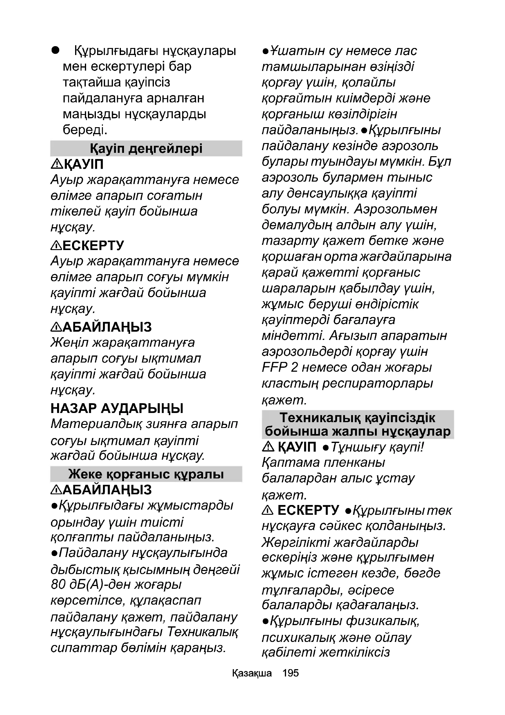 НАЗАР АУДАРЫҢЫ Материалдық зиянға апарып соғуы ықтимал қауіпті жағдай бойынша нұсқау. Жеке қорғаныс құралы 몇 АБАЙЛАҢЫЗ ●Құрылғыдағы жұмыстарды орындау үшін тиісті қолғапты пайдаланыңыз. ●Пайдалану нұсқаулығында дыбыстық қысымның деңгейі 80 дБ(A)-ден жоғары көрсетілсе, құлақаспап пайдалану қажет, пайдалану нұсқаулығындағы Техникалық сипаттар бөлімін қараңыз. ●Ұшатын су немесе лас тамшыларынан өзіңізді қорғау үшін, қолайлы қорғайтын киімдерді жəне қорғаныш көзілдірігін пайдаланыңыз. ●Құрылғыны пайдалану кезінде аэрозоль булары туындауы мүмкін. Бұл аэрозоль булармен тыныс алу денсаулыққа қауіпті болуы мүмкін. Аэрозольмен демалудың алдын алу үшін, тазарту қажет бетке жəне қоршаған орта жағдайларына қарай қажетті қорғаныс шараларын қабылдау үшін,