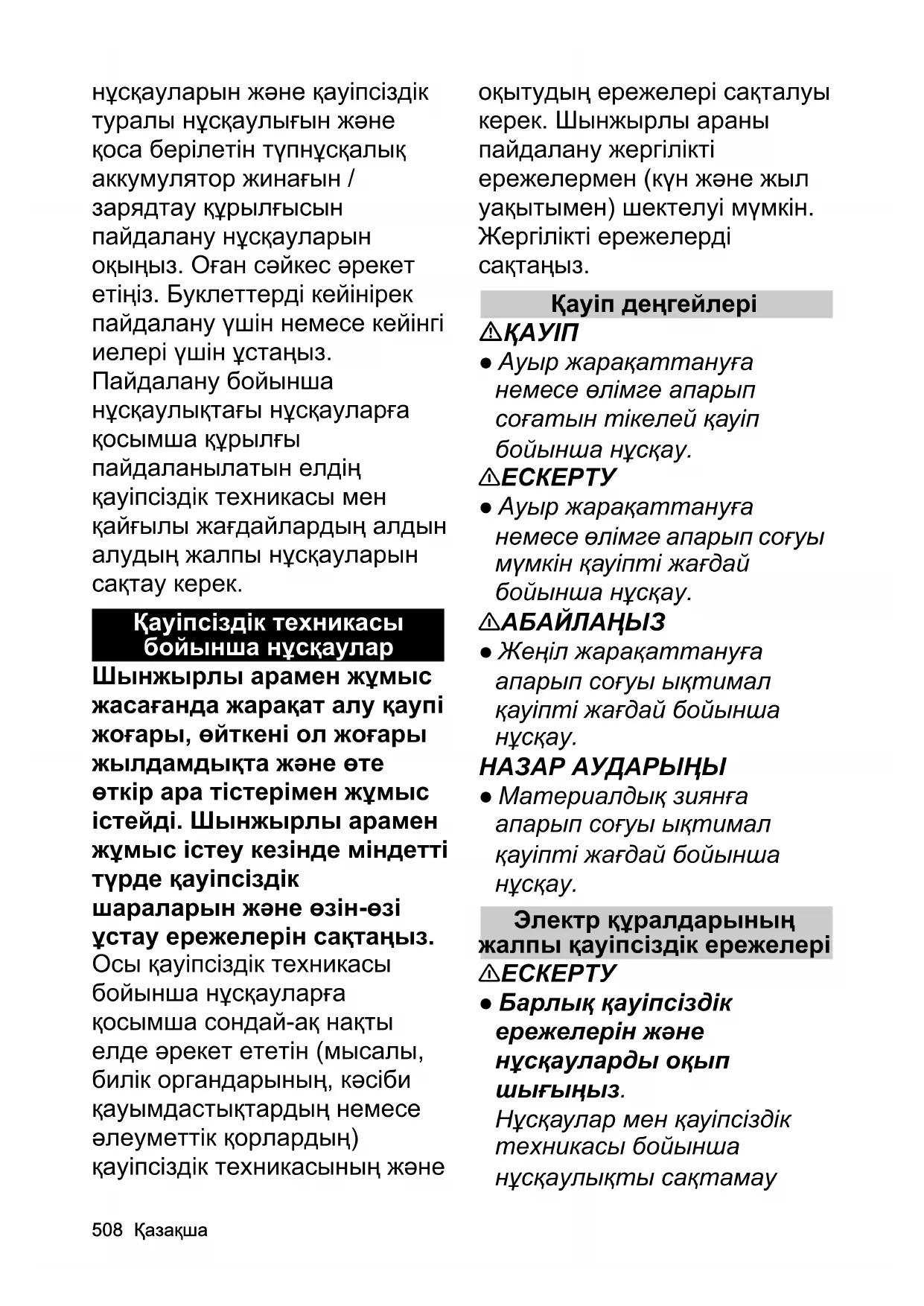 Нұсқаулар мен қауіпсіздік техникасы бойынша нұсқаулықты сақтамауҚазақша 509 электр тогының соғуына жəне/немесе ауыр жарақатқа əкелуі мүмкін. Болашақ үшін барлық қауіпсіздік пен нұсқауларды сақтаңыз. Қауіпсіздік техникасы бойынша нұсқаулықта қолданылатын «электр құралы» термині электр қуатымен жұмыс істейтін электр құралдарына (қуат сымы бар) жəне аккумуляторлық электр құралдарына (қуат сымы жоқ)