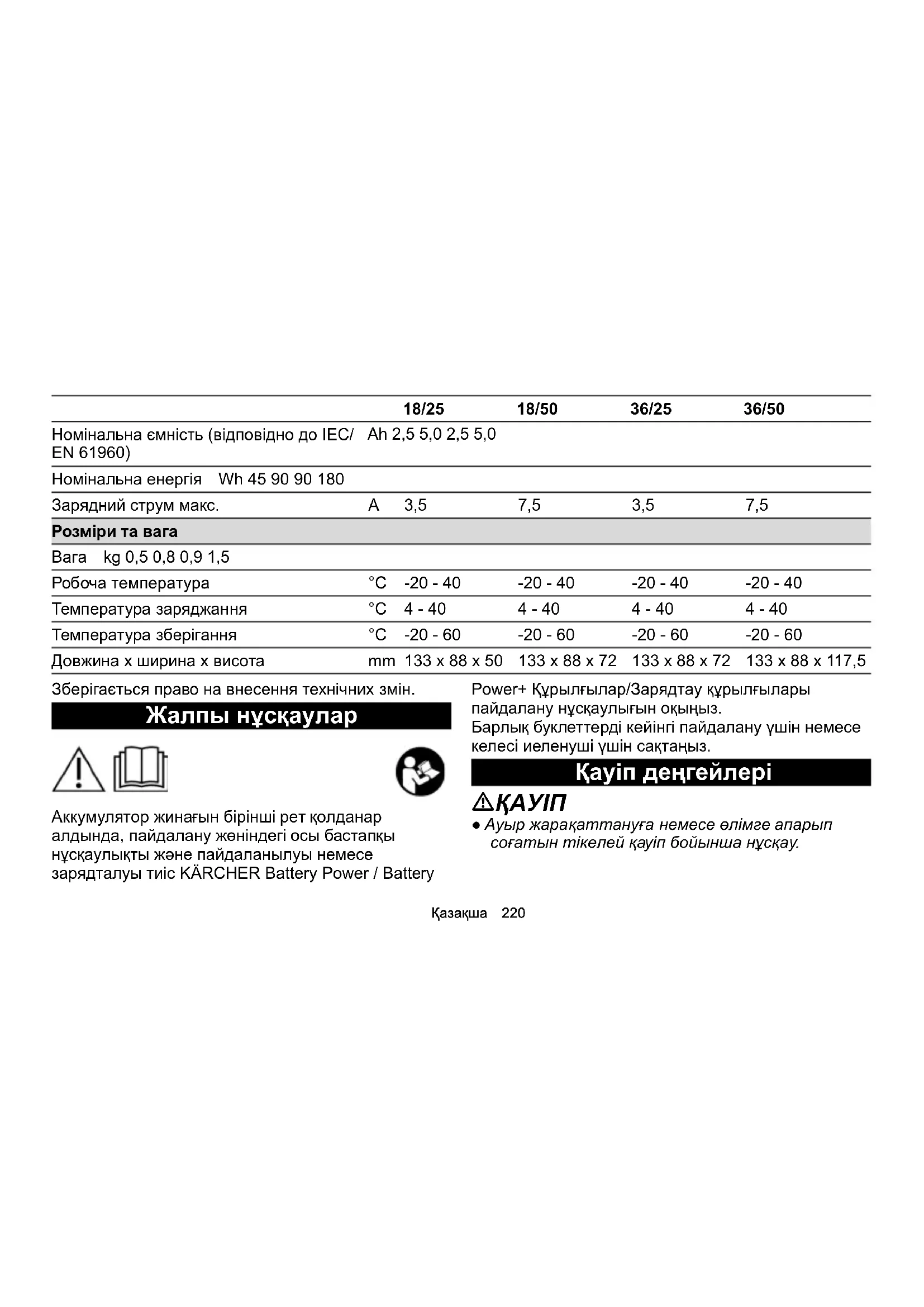 Battery Power + Тип акумуляторного блока Li-ION Li-ION Li-ION Li-IONҚазақша 220 Зберігається право на внесення технічних змін. Жалпы нұсқаулар Аккумулятор жинағын бірінші рет қолданар алдында, пайдалану жөніндегі осы бастапқы нұсқаулықты жəне пайдаланылуы немесе зарядталуы тиіс KÄRCHER Battery Power / Battery Power+ Құрылғылар/Зарядтау құрылғылары пайдалану нұсқаулығын оқыңыз. Барлық буклеттерді кейінгі пайдалану үшін немесе келесі иеленуші үшін сақтаңыз. Қауіп деңгейлері