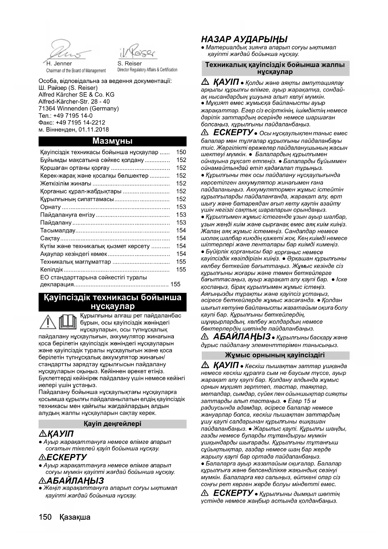 - ЕО стандарттарына сəйкестігі туралы декларация Chairman of the Board of ManagementDirector Regulatory Affairs & Certification H. Jenner S. ReiserҚазақша 151 ● Ток ұру қаупі бар болса, құрылғыны пайдаланбаңыз. ● Күндізгі уақытта немесе жақсы жасанды жарықтандыруда ғана шабыңыз. ● Балаларды шабу ортасынан аулақ жəне пайдаланушы емес ересек адамның қадағалауында ұстаңыз; бала шабу ортасына кіргенде сақ болыңыз жəне құрылғыны өшіріңіз. ● Көруіңізге əсер ететін соқыр бұрыштарға, бұталарға, ағаштарға немесе заттарға жақындағанда сақ болыңыз. НАЗАР АУДАРЫҢЫ ● Құрылғыны пайдаланушы басқа адамдармен немесе олардың мүлкімен болған апаттарға жауапты. Қауіпсіз жұмыс ҚАУІП ● Құрылғыны қолданар алдында, пышақ, пышақ болттары мен пышақ бөлігі тозып, зақымдалмағанына көз жеткізіңіз. ● Қосу/өшіру түймесін ҚОСУЛЫ күйде ешқашан құлыптамаңыз, бұл өте қауіпті. ● Қажет болса ғана құрылғыны артқа қарай тартыңыз. Егер құрылғыны қабырғадан немесе кедергілерден жылжыту қажет болса, алдымен шалынып, сырғанап кетпес үшін астына қараңыз. ● Ашық пышақпен жанасудан немесе қауіпті заттармен соққы алудан жарақаттану қаупі. Қозғалтқышты қосқанда немесе қозғалтқыш жұмыс істеп тұрған кезде құрылғыны тік ұстаңыз. Егер жалтару өте қажет болса, мысалы іске қосуды жеңілдету үшін, құрылғының алдыңғы бөлігін 5 см қашықтықта көтеруге болады. Тұтқаны мұқият төмен басыңыз. Шабуды бастағанға дейін машинаны қалыпты жұмыс күйіне (яғни, төрт дөңгелегі p. 155