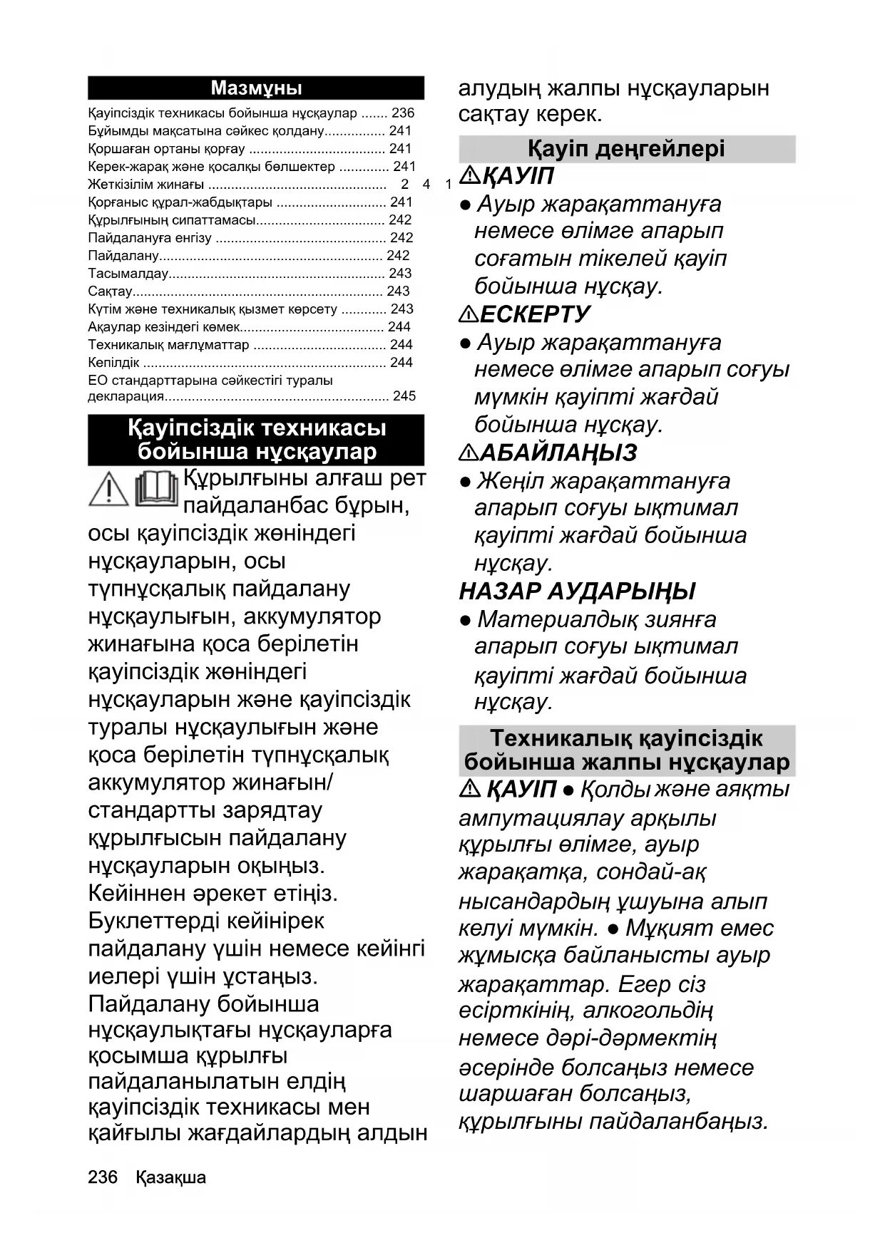 - ампутациялау арқылы құрылғы өлімге, ауыр жарақатқа, сондай-ақ нысандардың ұшуына алып келуі мүмкін. ● Мұқият емес жұмысқа байланысты ауыр жарақаттар. Егер сіз есірткінің, алкогольдің немесе дəрі-дəрмектің əсерінде болсаңыз немесе шаршаған болсаңыз, құрылғыны пайдаланбаңыз. Қауіпсіздік техникасы бойынша нұсқаулар p. 236