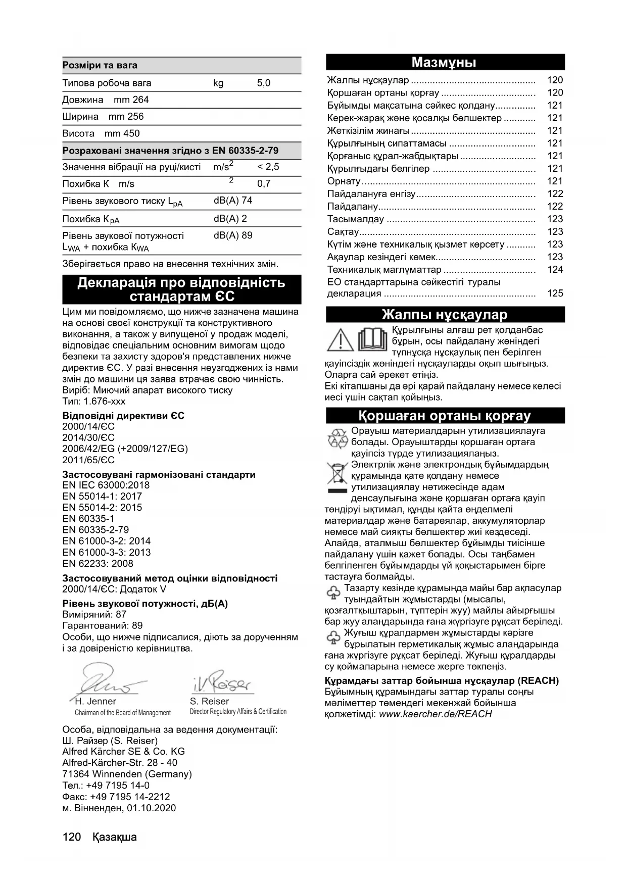 dB(A) 89Қазақша 125 ЕО стандарттарына сəйкестігі туралы декларация Осымен төменде көрсетілген машина қауіпсіздік жəне денсаулық қорғау бойынша ЕО директиваларының талаптарына сəйкес келетіні мəлімдейміз. Бізбен келісусіз машинаның конструкциясы өзгерген жағдайда осы декларация өз күшін жояды. Бұйым: Жоғарғы қысымды жуғыш Типі: 1.676-xxx Қолданыстағы ЕО директивалары 2000/14/EG 2014/30/EU 2006/42/EG (+2009/127/EG) 2011/65/EU Қолданылатын біріздендірілген стандарттар EN IEC 63000:2018 EN 55014-1: 2017 EN 55014-2: 2015 EN 60335-1 EN 60335-2-79 EN 61000-3-2: 2014 EN 61000-3-3: 2013 EN 62233: 2008 Сəйкестікті бағалаудың қолданбалы əдісі 2000/14/EC: V қосымшасы Дыбыс қуаттылығының деңгейі дБ(А) Өлшенді: 87