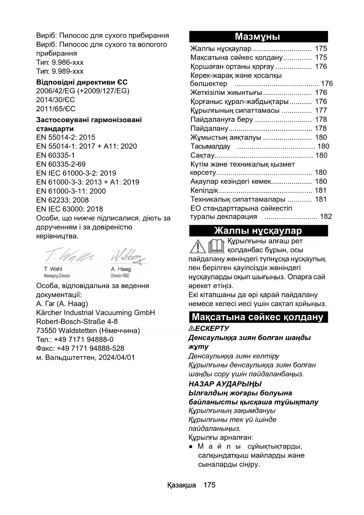 Өнім: Ылғал жəне құрғақ тазалауға арналған шаңсорғыш Типі: 9.986-xxx Типі: 9.989-xxx Қолданыстағы ЕО директивалары 2006/42/EG (+2009/127/EG) 2014/30/EU 2011/65/EU Қолданылатын біріздендірілген стандарттар EN 55014-2: 2015 EN 55014-1: 2017 + A11: 2020 EN 60335-1 EN 60335-2-69