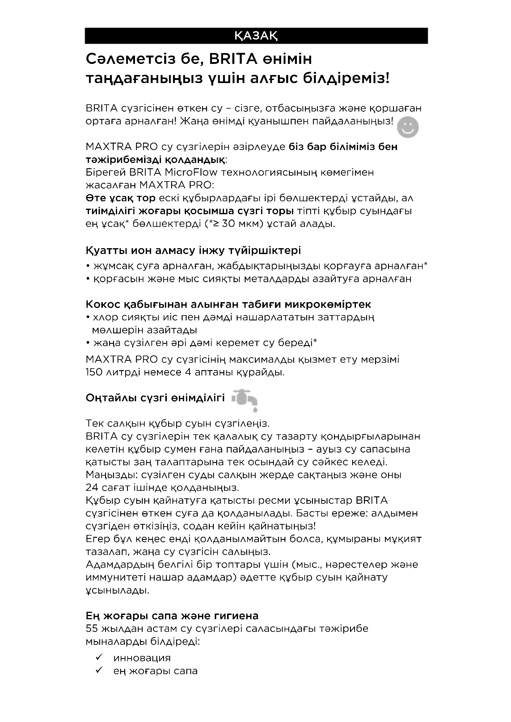 - Bu su filtri sistemi DIN EN 17093:2018 standartına əsasən qurğuşun, mis, xlor və karbonat codluğu üçün yoxlanmışdır (ərpin 120L üçün azalacağı təsdiqlənmişdir).ҚАЗАҚ Сәлеметсіз бе, BRITA өнімін таңдағаныңыз үшін алғыс білдіреміз! BRITA сүзгісінен өткен су – сізге, отбасыңызға және қоршаған ортаға арналған! Жаңа өнімді қуанышпен пайдаланыңыз! MAXTRA PRO су сүзгілерін әзірлеуде біз бар біліміміз бен тәжірибемізді қолдандық: Бірегей BRITA MicroFlow технологиясының көмегімен жасалған MAXTRA PRO: Өте ұсақ тор ескі құбырлардағы ірі бөлшектерді ұстайды, ал тиімділігі жоғары қосымша сүзгі торы тіпті құбыр суындағы ең ұсақ* бөлшектерді (*≥ 30мкм) ұстай алады. Қуатты ион алмасу інжу түйіршіктері