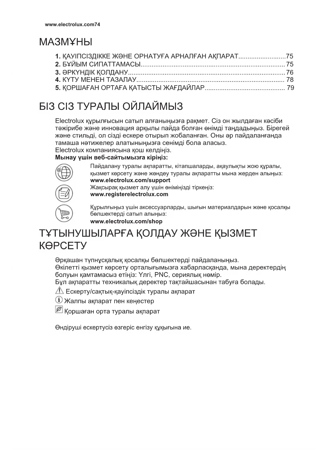 БІЗ СІЗ ТУРАЛЫ ОЙЛАЙМЫЗ Electrolux құрылғысын сатып алғаныңызға рақмет. Сіз он жылдаған кәсіби тәжірибе және инновация арқылы пайда болған өнімді таңдадыңыз. Бірегей және стильді, ол сізді ескере отырып жобаланған. Оны әр пайдаланғанда тамаша нәтижелер алатыныңызға сенімді бола аласыз. Electrolux компаниясына қош келдіңіз. Мынау үшін веб-сайтымызға кіріңіз: Пайдалану туралы ақпаратты, кітапшаларды, ақаулықты жою құралы, қызмет көрсету және жөндеу туралы ақпаратты мына жерден алыңыз: www.electrolux.com/support Жақсырақ қызмет алу үшін өніміңізді тіркеңіз: www.registerelectrolux.com Құрылғыңыз үшін аксессуарларды, шығын материалдарын және қосалқы бөлшектерді сатып алыңыз: www.electrolux.com/shop ТҰТЫНУШЫЛАРҒА ҚОЛДАУ ЖӘНЕ ҚЫЗМЕТ