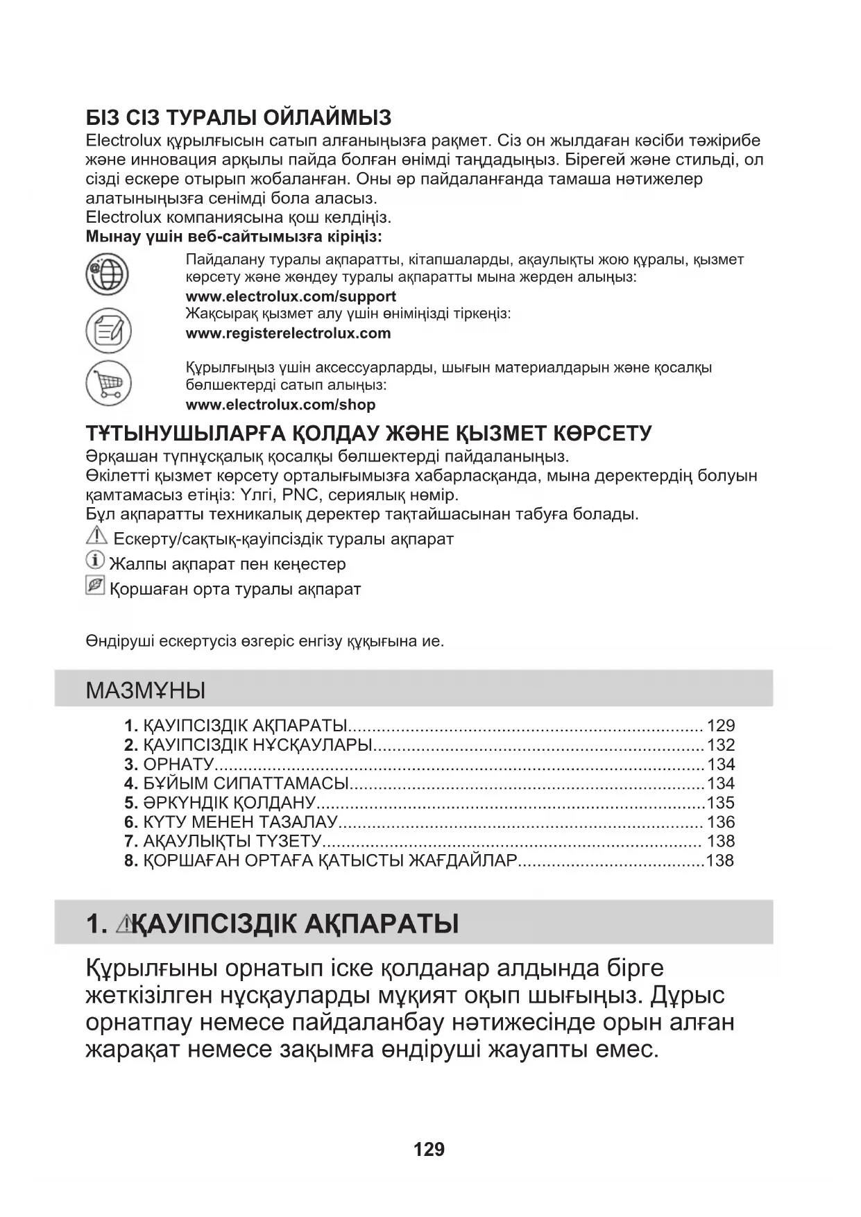 Riciclare i materiali con il simbolo . Buttare l'imballaggio negli appositi contenitori per il riciclaggio. Aiutare a proteggere l’ambiente e la salute umana e a riciclare rifiuti derivanti da apparecchiature elettriche ed elettroniche. Non smaltire le apparecchiature che riportano il simbolo insieme ai normali rifiuti domestici. Portare il prodotto al punto di riciclaggio più vicino o contattare il comune di residenza. 128БІЗ СІЗ ТУРАЛЫ ОЙЛАЙМЫЗ Electrolux құрылғысын сатып алғаныңызға рақмет. Сіз он жылдаған кәсіби тәжірибежәне инновация арқылы пайда болған өнімді таңдадыңыз. Бірегей және стильді, олсізді ескере отырып жобаланған. Оны әр пайдаланғанда тамаша нәтижелералатыныңызға сенімді бола аласыз.Electrolux компаниясына қош келдіңіз.Мынау үшін веб-сайтымызға кіріңіз:Пайдалану туралы ақпаратты, кітапшаларды, ақаулықты жою құралы, қызметкөрсету және жөндеу туралы ақпаратты мына жерден алыңыз:www.electrolux.com/supportЖақсырақ қызмет алу үшін өніміңізді тіркеңіз:www.registerelectrolux.comҚұрылғыңыз үшін аксессуарларды, шығын материалдарын және қосалқыбөлшектерді сатып алыңыз:www.electrolux.com/shop ТҰТЫНУШЫЛАРҒА ҚОЛДАУ ЖӘНЕ ҚЫЗМЕТ КӨРСЕТУ Әрқашан түпнұсқалық қосалқы бөлшектерді пайдаланыңыз.Өкілетті қызмет көрсету орталығымызға хабарласқанда, мына деректердің болуынқамтамасыз етіңіз: Үлгі, PNC, сериялық нөмір.Бұл ақпаратты техникалық деректер тақтайшасынан табуға болады. Ескерту/сақтық-қауіпсіздік туралы ақпарат Жалпы ақпарат пен кеңестер Қоршаған орта туралы ақпаратӨндіруші ескертусіз өзгеріс енгізу құқығына ие.