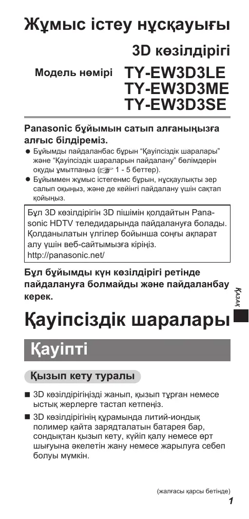 Бұл 3D көзілдірігін 3D пішімін қолдайтын Panasonic HDTV теледидарында пайдалануға болады. Қолданылатын үлгілер бойынша соңғы ақпарат алу үшін веб-сайтымызға кіріңіз. http://panasonic.net/