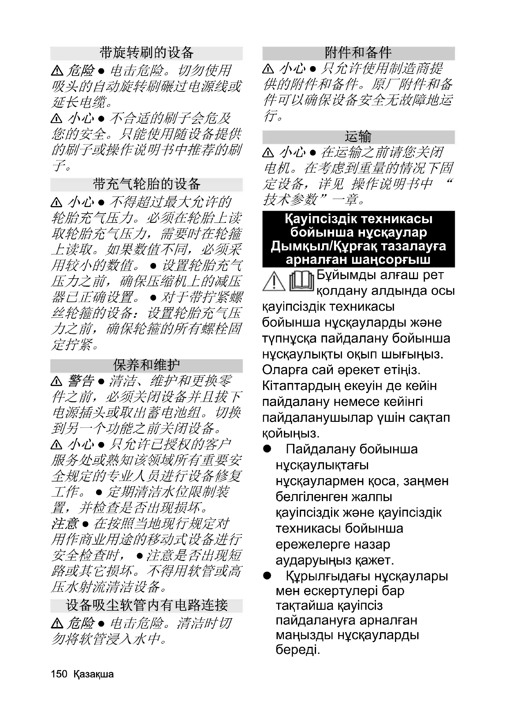 Айналмалы қылшақтары бар құрылғылар ҚАУІП ● Электр тогының соғу қаупі. Ешқашан желілік қосылым кабелін немесе ұзартқыш кабельді сору басының айналмалы қылшақтары арқылы жүргізбеңіз. 몇 АБАЙЛАҢЫЗ ● Жарамсыз қылшақтар сіздің қауіпсіздігіңізге қауіп төндіреді. Жеткізу жиынтығында бар немесе пайдалану нұсқаулығында ұсынылған қылшақтарды ғана пайдаланыңыз. Пневматикалық шиналардағы құрылғылар 몇 АБАЙЛАҢЫЗ ● Шиналардағы максималды жарамды. Қысымнан асыруға рұқсат етілмейді. Шинада жəне, қажет болса, дискіде156 Қазақша шиналардағы қысымды есептеу қажет. Əртүрлі мəндер болған кезде ең аз мəнді ұстау қажет. ● Шиналардағы қысымды реттеу алдында компрессордағы қысым редукторы дұрыс реттелгеніне көз жеткізіңіз. ● Бұралатын дискілері бар құрылғыларға арналған: Шиналардағы қысымды реттеу алдында дискінің барлық бекіткіш бұрандалары тығыз бұралғанына көз жеткізіңіз. Күтім жəне техникалық қызмет көрсету 몇 ЕСКЕРТУ ● Тазарту, техникалық қызмет көрсету