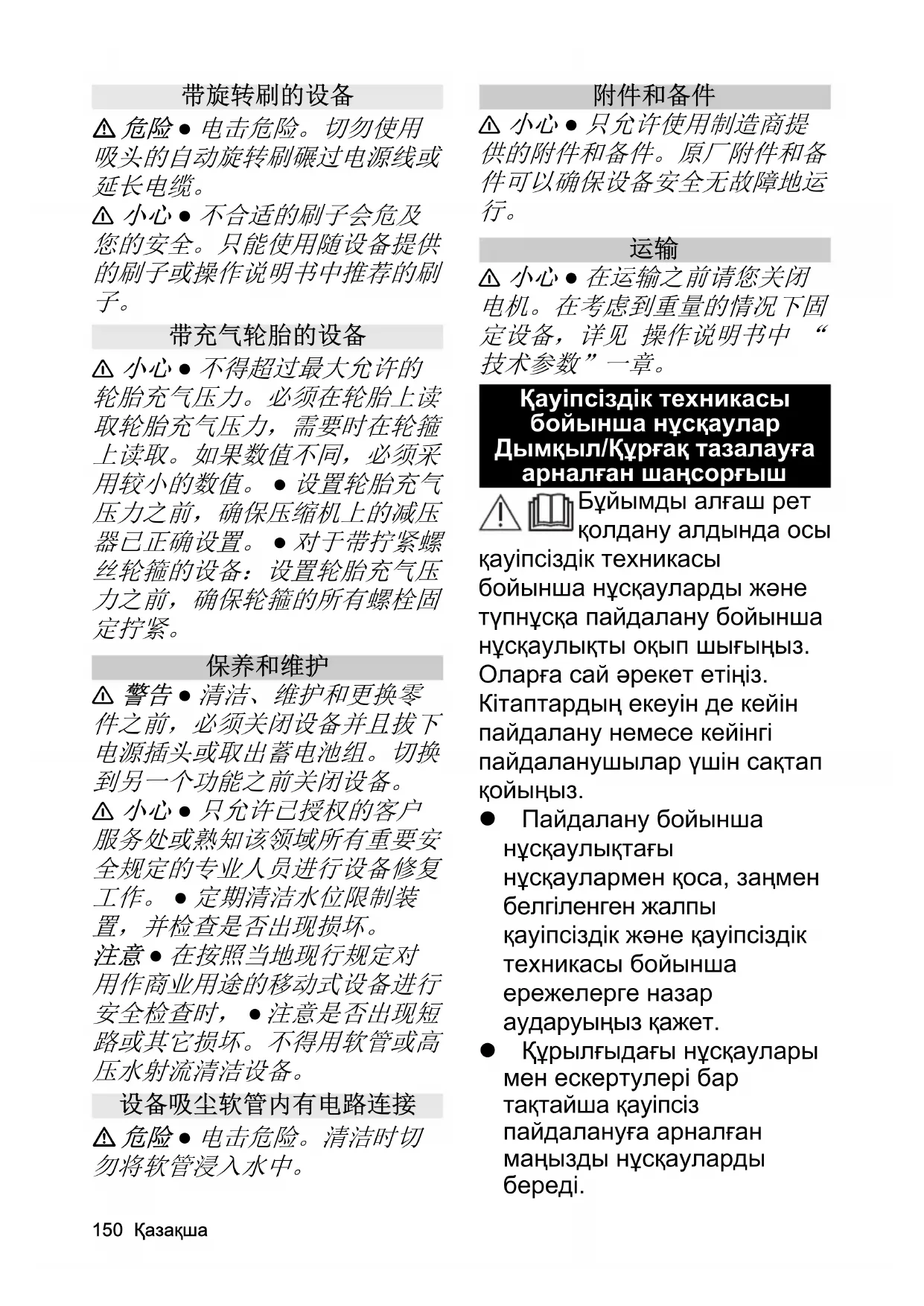 몇 ЕСКЕРТУ ● Құрылғы тек құрғақ тазалауға арналған. Құрылғыны тек сыртқы дымқыл жерлерде нақты түрде белгіленген кезде ғана пайдаланыңыз. Дымқыл шаңсорғыш 몇 АБАЙЛАҢЫЗ ● Сұйық орталарды тек 45 °C дейінгі температурада сорыңыз.154 Қазақша НАЗАР АУДАРЫҢЫ ● Құрылғыны салқындатқыштар мен жанар-жағармай материалдарын жоюға арналған тиісті жабдықтармен ғана қолданыңыз. L, M жəне H класты шаңы бар құрылғылар ҚАУІП ● Зиянды шаңнан қауіпті. Техникалық қызмет көрсету жұмыстары үшін (мысалы, сүзгіні ауыстыру) P2 немесе одан жоғары респираторды жəне бір реттік киімді киіңіз. ● Құрылғыны жəне оған арналған заттарды пайдалану, соның ішінде жазылған материалдарды