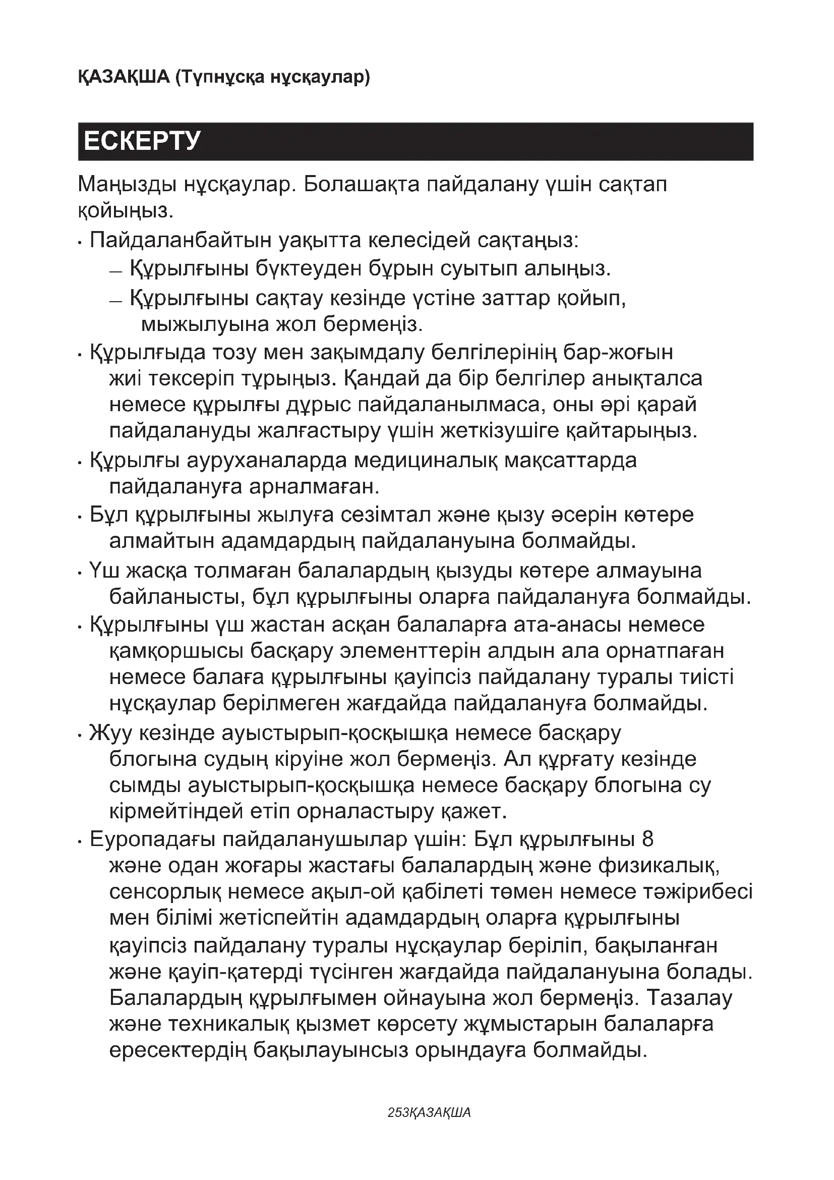 - Еуропадағы пайдаланушылар үшін: Бұл құрылғыны 8 және одан жоғары жастағы балалардың және физикалық, сенсорлық немесе ақыл-ой қабілеті төмен немесе тәжірибесі мен білімі жетіспейтін адамдардың оларға құрылғыны қауіпсіз пайдалану туралы нұсқаулар беріліп, бақыланған және қауіп-қатерді түсінген жағдайда пайдалануына болады. Балалардың құрылғымен ойнауына жол бермеңіз. Тазалау және техникалық қызмет көрсету жұмыстарын балаларға ересектердің бақылауынсыз орындауға болмайды.254 ҚАЗАҚША