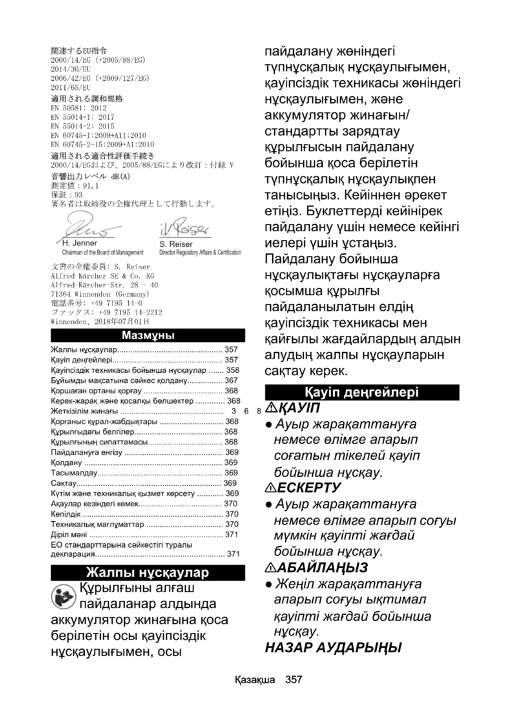 - ЕО стандарттарына сəйкестігі туралы декларация Chairman of the Board of ManagementDirector Regulatory Affairs & Certification H. Jenner S. Reiser358 Қазақша ● Материалдық зиянға апарып соғуы ықтимал қауіпті жағдай бойынша p. 371