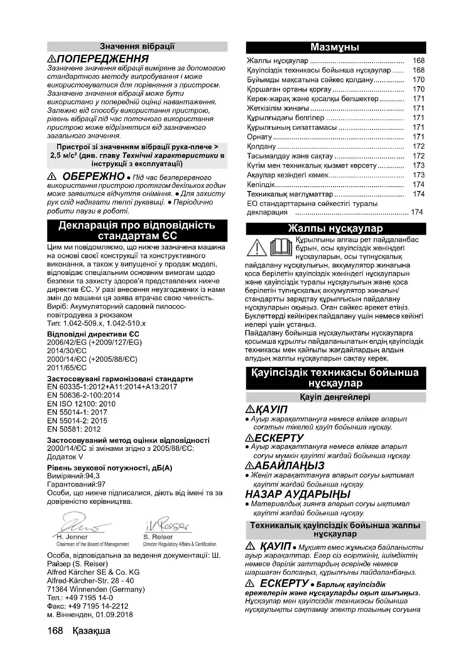 • ҚАУІП ● Мұқият емес жұмысқа байланысты ауыр жарақаттар. Егер сіз есірткінің, ішімдіктің немесе дəрілік заттардың əсерінде немесе шаршаған болсаңыз, құрылғыны пайдаланбаңыз. 몇 ЕСКЕРТУ ● Барлық қауіпсіздік ережелерін жəне нұсқауларды оқып шығыңыз. Нұсқаулар мен қауіпсіздік техникасы бойынша нұсқаулықты сақтамау электр тогының соғуына Chairman of the Board of ManagementDirector Regulatory Affairs & Certification H. Jenner S. Reiser Жалпы нұсқаулар p. 168