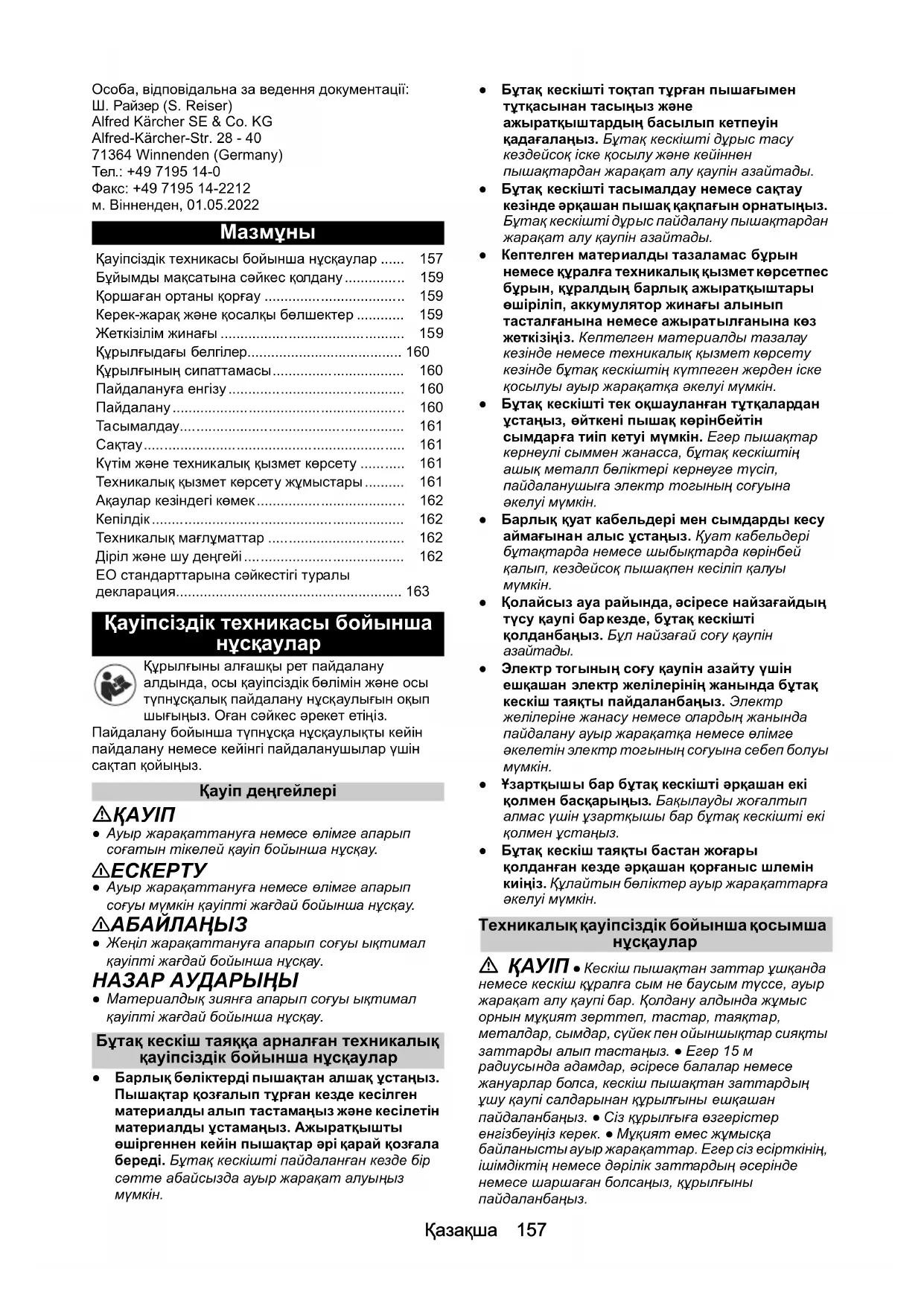 MT HT 550/36日本語 163 > 2,5 м/с² (Пайдалану нұсқаулығында Техникалық сипаттар) бір қолды дірілдеу мəні бар құрылғы 몇 АБАЙЛАҢЫЗ ● Көп сағатты, үздіксіз пайдаланылатын құрылғының есту қасиетін жоғалтуға əкелуі мүмкін. ● Қолды қорғау үшін жылы қолғаптарды қолданыңыз. ● Жұмыста жиі үзілістер жасап тұрыңыз. ЕО стандарттарына сəйкестігі туралы декларация Осымен төменде көрсетілген машина қауіпсіздік жəне денсаулық қорғау бойынша ЕО директиваларының талаптарына сəйкес келетіні мəлімдейміз. Бізбен келісусіз машинаның конструкциясы өзгерген жағдайда осы декларация өз күшін жояды. Өнім: Аккумуляторлық бұтақ кескіш таяқ Типі: 1.042-511.0 + 1.042-513.0 Қолданыстағы ЕО директивалары 2006/42/EG (+2009/127/EG)2014/30/EU2000/14/EG (+2005/88/EG)2011/65/EU Қолданылатын біріздендірілген стандарттар EN 62841-1: 2015+A11: 2022EN 62841-4-2:2019EN 55014-1: 2017 + A11: 2020EN 55014-2: 1997+A1: 2001+A2: 2008EN IEC 63000: 2018 Сəйкестікті бағалаудың қолданбалы əдісі 2000/14/EG жəне 2005/88/EG арқылы өзгертілді: V қосымшасы Дыбыс қуаттылығының деңгейі дБ(А)Өлшенді:93,9Кепілдік береді:95 Қол қойғандар басқарманың тапсырмасы мен уəкілдігі бойынша əрекет етеді. Құжаттаманы жүргізетін уəкілетті тұлға: С. РайзерAlfred Kärcher SE & Co. KGAlfred-Kärcher-Str. 28 - 4071364 Winnenden (Германия)Тел.: +49 7195 14-0Телефакс: +49 7195 14-2212Winnenden, 2022/05/01