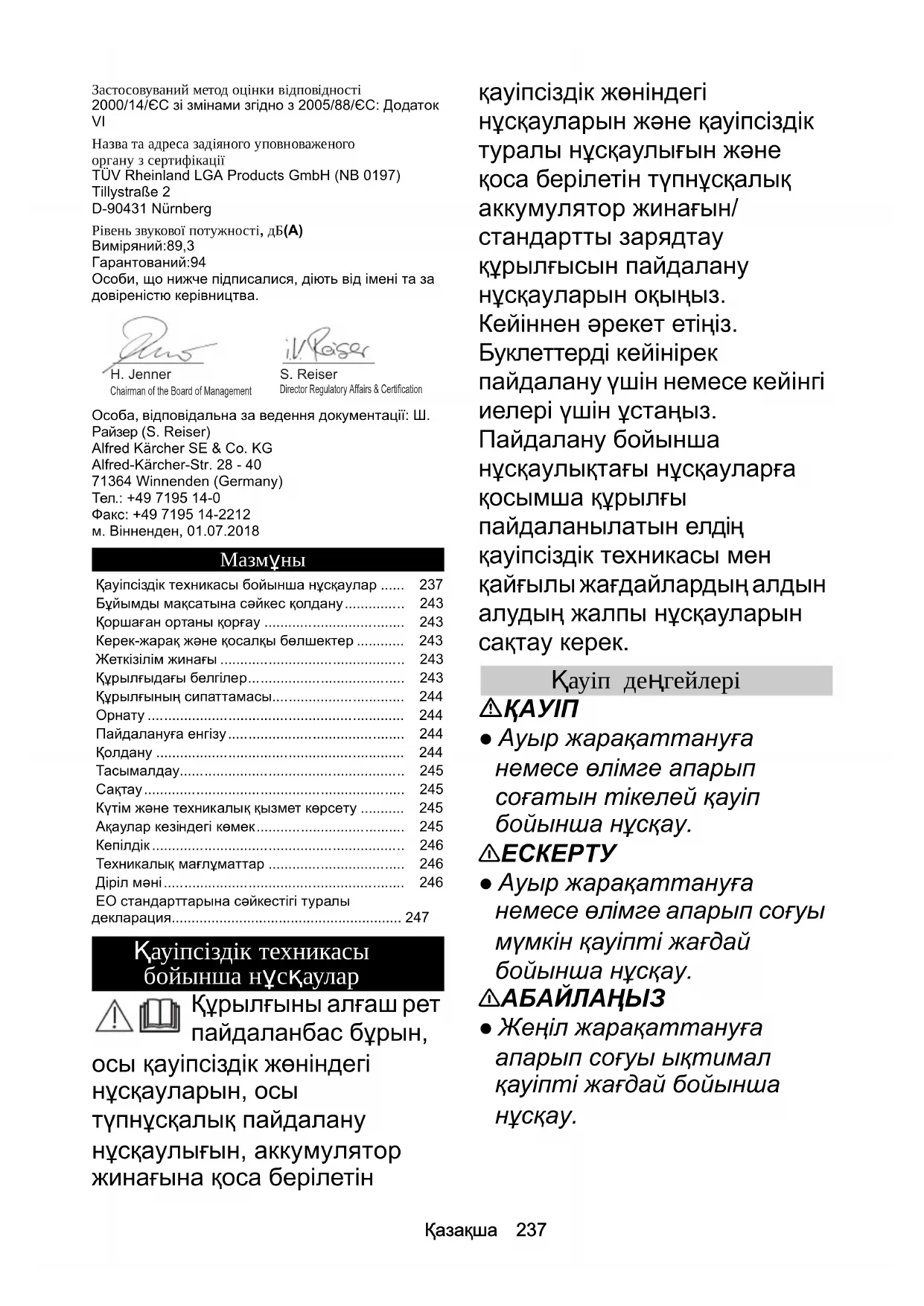 Тіркелген органның атауы жəне мекен-жайы TÜV Rheinland LGA Products GmbH (НБ 0197) Тиллиштрасе 2 Д-90431 Нюрнберг Дыбыс қуаттылығының деңгейі дБ(А) Өлшенді:89,3 Кепілдік береді:94 Қол қойғандар басқарманың тапсырмасы мен уəкілдігі бойынша əрекет етеді. Құжаттаманы жүргізетін уəкілетті тұлға С. Райзер Alfred Kärcher GmbH & Co. KG Alfred-Kärcher-Str. 28 - 40 71364 Winnenden (Германия) Тел.: +49 7195 14-0 Телефакс: +49 7195 14-2212 Winnenden, 2018/07/01