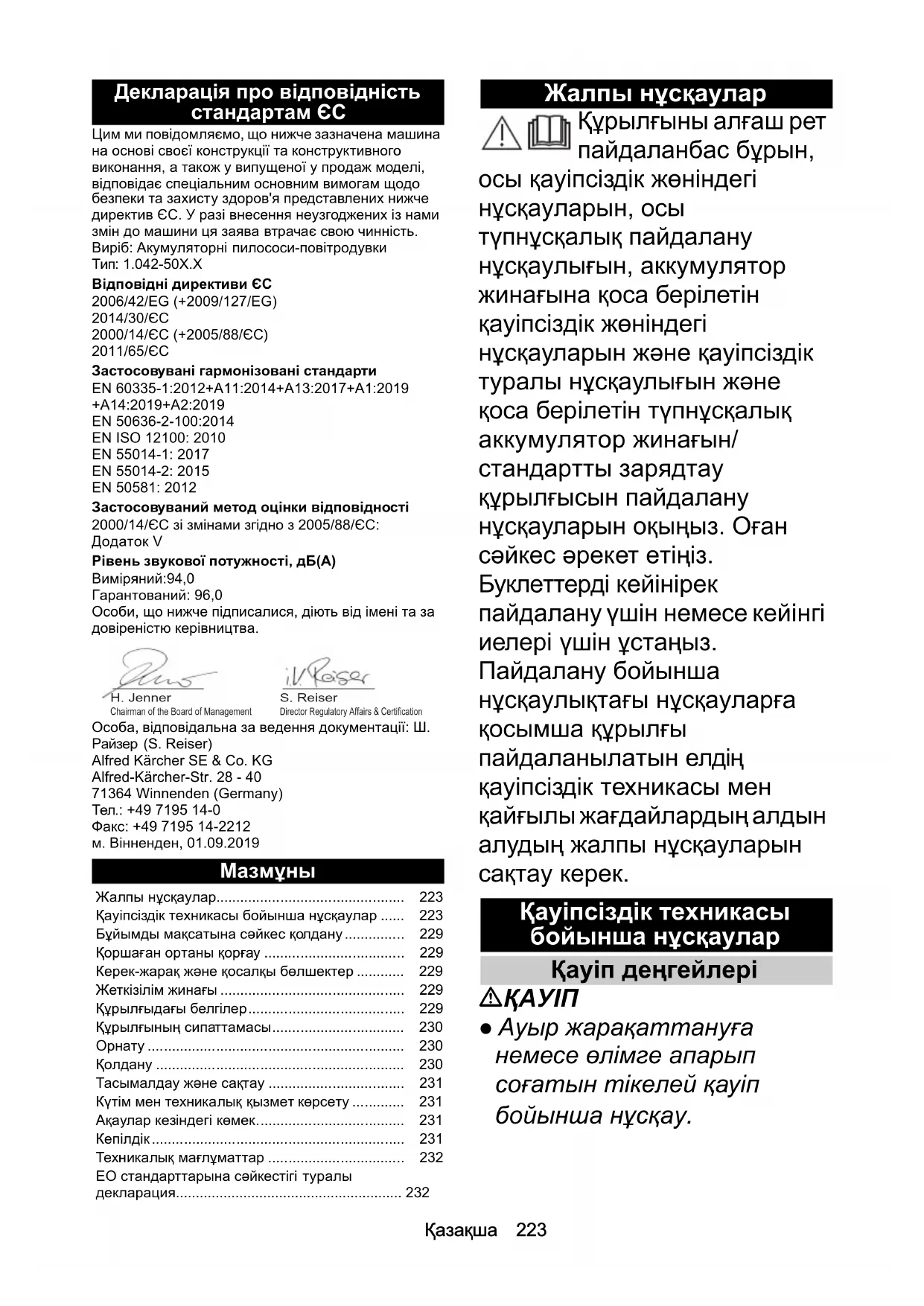 > 2,5 м/с² (Пайдалану нұсқаулығында Техникалық сипаттар) бір қолды дірілдеу мəні бар құрылғы 몇 АБАЙЛАҢЫЗ ● Көп сағатты, үздіксіз пайдаланылатын құрылғының есту қасиетін жоғалтуға əкелуі мүмкін. ● Қолды қорғау үшін жылы қолғаптарды қолданыңыз. ● Жұмыста жиі үзілістер жасап тұрыңыз. ЕО стандарттарына сəйкестігі туралы декларация Осымен төменде көрсетілген машина қауіпсіздік жəне денсаулық қорғау бойынша ЕО директиваларының талаптарына сəйкес келетіні мəлімдейміз. Бізбен келісусіз машинаның конструкциясы өзгерген жағдайда осы декларация өз күшін жояды. Өнім: Аккумуляторлы жапырақ үрлегіш Типі: 1.042-50X.X Қолданыстағы ЕО директивалары 2006/42/EG (+2009/127/EG) 2014/30/EU 2000/14/EG (+2005/88/EG) 2011/65/EU Қолданылатын біріздендірілген стандарттар EN 60335-1:2012+A11:2014+A13:2017+A1:2019 +A14:2019+A2:2019 EN 50636-2-100:2014 EN ISO 12100: 2010 EN 55014-1: 2017 EN 55014-2: 2015 EN 50581: 2012 Сəйкестікті бағалаудың қолданбалы əдісі 2000/14/EG жəне 2005/88/EG арқылы өзгертілді: V қосымшасы Дыбыс қуаттылығының деңгейі