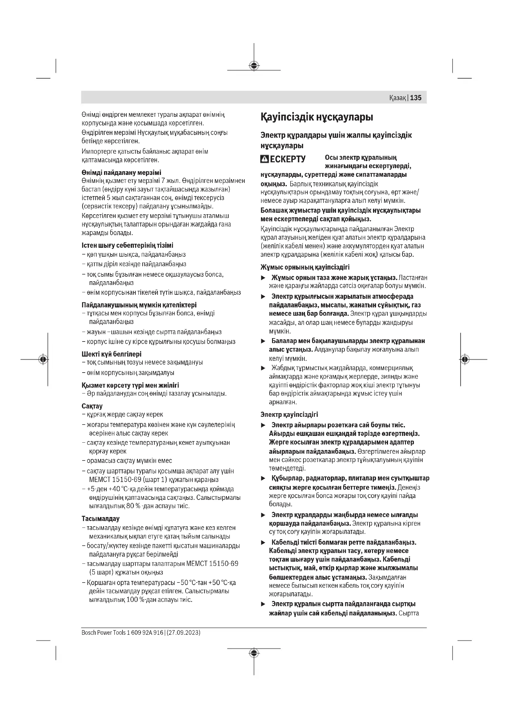 Еуразия экономикалық одағына (Кеден одағына) мүше мемлекеттер аумағында қолданылады Өндірушінің өнім үшін қарастырған пайдалану құжаттарының құрамында пайдалану жөніндегі осы нұсқаулық, сонымен бірге қосымшалар да болуы мүмкін. Сəйкестікті растау жайлы ақпарат қосымшада бар. 1 609 92A 916 | (27.09.2023) Bosch Power ToolsҚазақ | 135 Өнімді өндірген мемлекет туралы ақпарат өнімнің корпусында жəне қосымшада көрсетілген. Өндірілген мерзімі Нұсқаулық мұқабасының соңғы бетінде көрсетілген. Импортерге қатысты байланыс ақпарат өнім қаптамасында көрсетілген. Өнімді пайдалану мерзімі Өнімнің қызмет ету мерзімі 7жыл. Өндірілген мерзімнен бастап (өндіру күні зауыт тақтайшасында жазылған) істетпей 5жыл сақтағаннан соң, өнімді тексерусіз (сервистік тексеру) пайдалану ұсынылмайды. Көрсетілген қызмет ету мерзімі тұтынушы аталмыш нұсқаулықтың талаптарын орындаған жағдайда ғана жарамды болады. Iстен шығу себептерінің тізімі – қөп үшқын шықса, пайдаланбаңыз – қатты діріл кезінде пайдаланбаңыз – тоқ сымы бұзылған немесе оқшаулаусыз болса, пайдаланбаңыз – өнім корпусынан тікелей түтін шықса, пайдаланбаңыз Пайдаланушының мүмкін қателіктері – тұтқасы мен корпусы бұзылған болса, өнімді пайдаланбаңыз – жауын –шашын кезінде сыртта пайдаланбаңыз – корпус ішіне су кірсе құрылғыны қосушы болмаңыз Шекті күй белгілері – тоқ сымының тозуы немесе зақымдануы – өнім корпусының зақымдалуы Қызмет көрсету түрі мен жиілігі – Әр пайдаланудан соң өнімді тазалау ұсынылады.