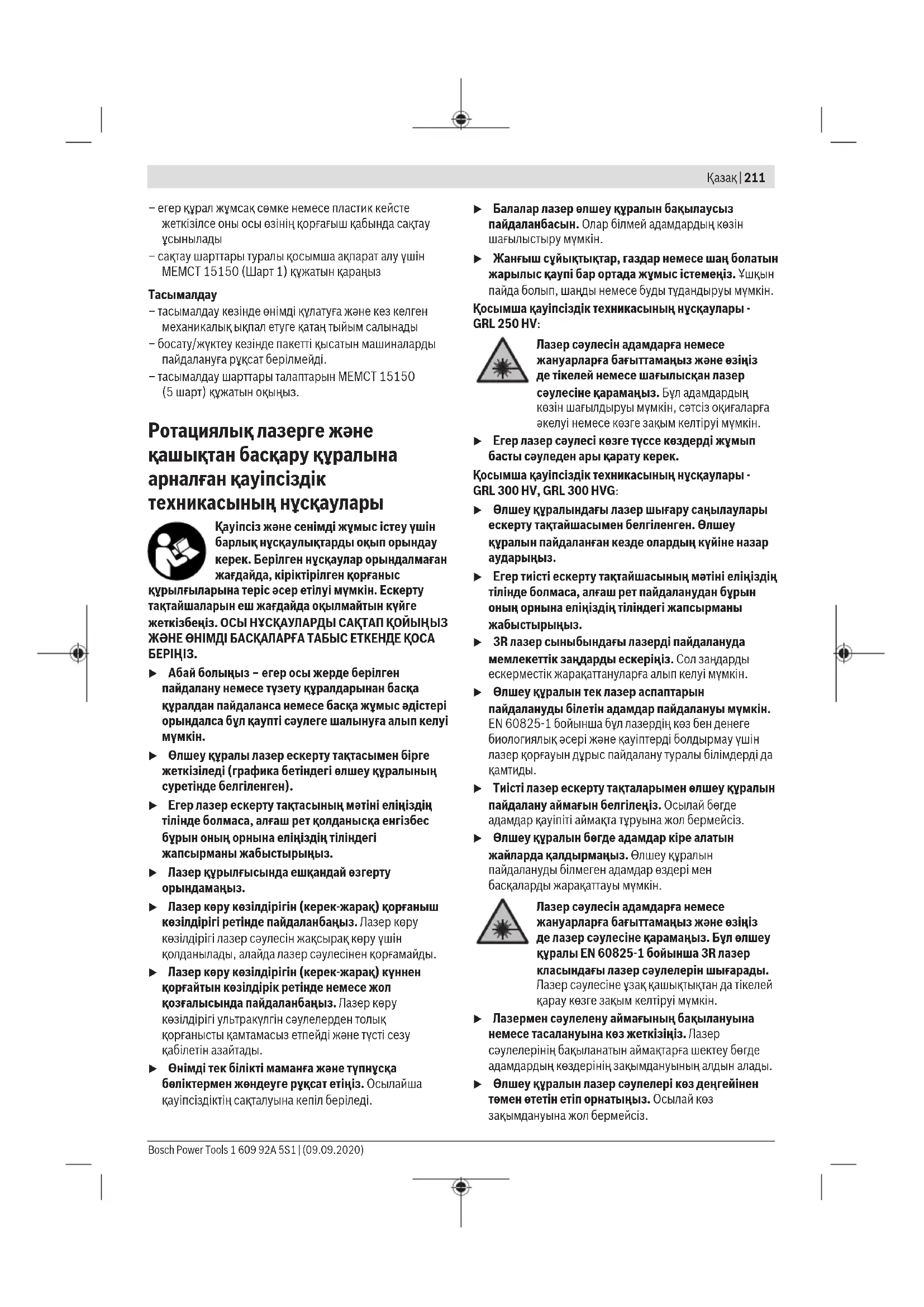 u Тиісті лазер ескерту тақталарымен өлшеу құралын пайдалану аймағын белгілеңіз. Осылай бөгде адамдар қауіпіті аймақта тұруына жол бермейсіз. u Өлшеу құралын бөгде адамдар кіре алатын жайларда қалдырмаңыз. Өлшеу құралын пайдалануды білмеген адамдар өздері мен басқаларды жарақаттауы мүмкін. Лазер сәулесін адамдарға немесе жануарларға бағыттамаңыз және өзіңіз де лазер сәулесіне қарамаңыз. Бұл өлшеу құралы EN60825‑1 бойынша 3R лазер класындағы лазер сәулелерін шығарады. Лазер сәулесіне ұзақ қашықтықтан да тікелей қарау көзге зақым келтіруі мүмкін. u Лазермен сәулелену аймағының бақылануына немесе тасалануына көз жеткізіңіз. Лазер сәулелерінің бақыланатын аймақтарға шектеу бөгде адамдардың көздерінің зақымдануының алдын алады. u Өлшеу құралын лазер сәулелері көз деңгейінен төмен өтетін етіп орнатыңыз. Осылай көз зақымдануына жол бермейсіз. Bosch Power Tools 1 609 92A 5S1 | (09.09.2020)212 | Қазақ u Терезе немесе айна сияқты тегіс беттерден лазер сәулесінің қайтарылуына жол бермеңіз. Қайтарылған лазер сәулесі да көзге зиянды болуы