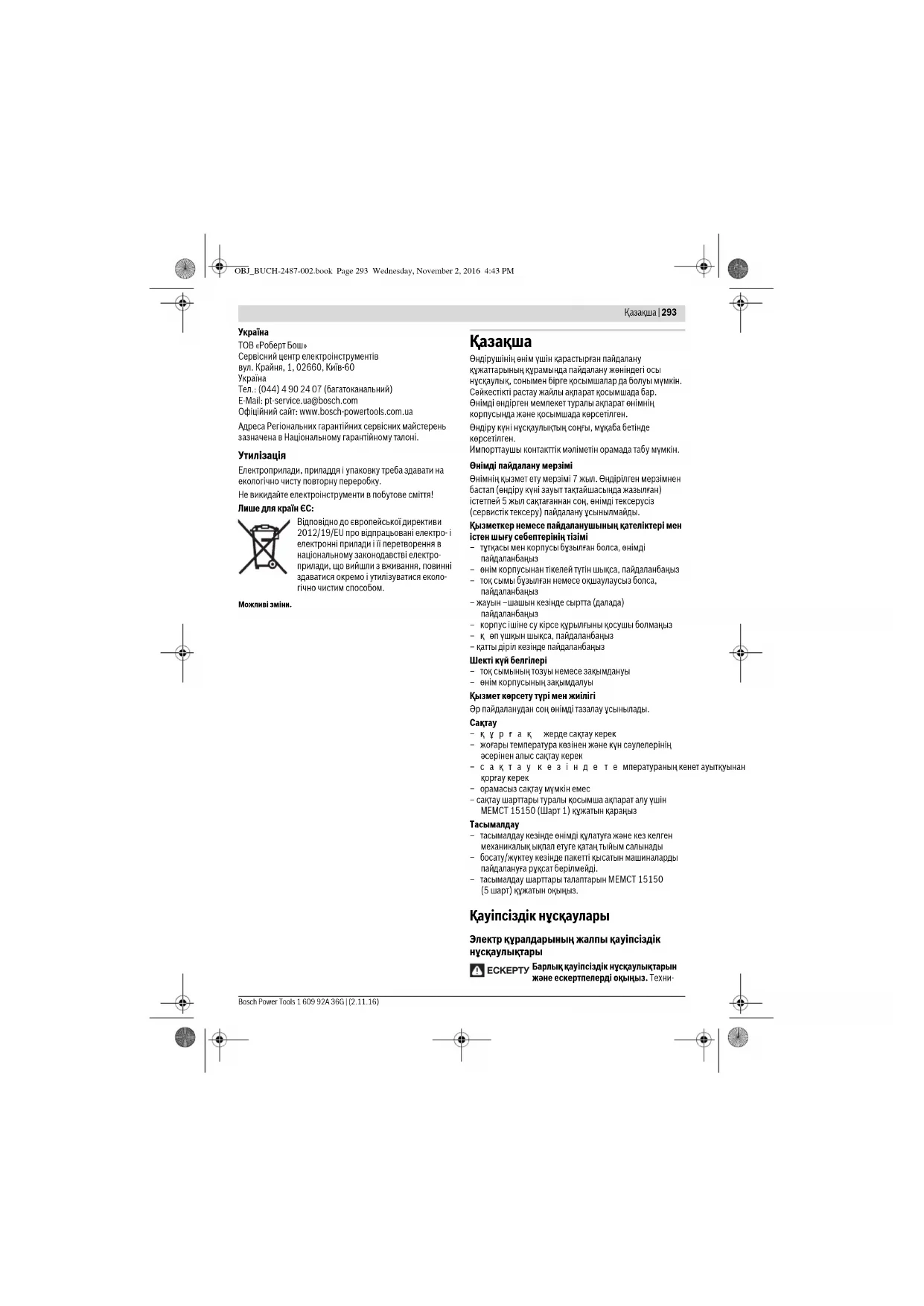 OBJ_BUCH-2487-002.book Page 302 Wednesday, November 2, 2016 4:43 PMҚaзақша | 303 Bosch Power Tools 1 609 92A 36G | (2.11.16) Осы ескертпелерде берілген дірілдеу пәрмені EN 60745 ережесінде мөлшерленген өлшеу әдісі бойынша есептелген болып электр құралдарды бір-бірімен салыстыру үшін пайдаланылуы мүмкін. Ол дірілдеу қуатын шамалап өлшеу үшін де жарамды. Берілген діріл көлемі электр құралының негізгі жұмыстары үшін берілген. Егер электр құрал басқа жұмыстар үшін түрлі керек-жарақтармен басқа алмалы- салмалы аспаптар менен немесе жетімсіз күтумен пайдаланылса дірілдеу көлемдері өзгереді. Бұл жұмыс барысындағы діріл қуатын арттырады. Дірілдеу қуатын нақты есептеу үшін құрал өшірілген және қосылған болып пайдаланылмаған уақыттарды да ескеру қажет. Бұл дірілдеу қуатын бүкіл жұмыс уақытында қатты төмендетеді. Пайдаланушыны дірілдеу әсерінен сақтау үшін қосымша қауіпсіздік шараларын қолдану қа жет, мысалы: электр құралды және алмалы-салмалы аспаптарды күту, қолдарды ыстық ұстау, жұмыс әдістерін ұйымдыстыру. Сәйкестік мәлімдемесі Жеке жауапкершілікпен біз “Техникалық мәліметтер” де сипатталған өнімнің 2011/65/EU, 2016 жыл 19 сәуіріне дейін: 2014/108/EC, 2016 жыл 20 сәуірінен соң 2014/30/EU, 2006/42/EC ережелеріндегі барлық тиісті анықтамаларына өзгерістері менен бірге сәйкес екенін және төмендегі нормаларға сай екенін кепілдендіреміз: EN 60745-1, EN 60745-2-3, EN50581. Техникалық құжаттар (2006/42/EC) төмендегідеi: Robert Bosch Power Tools GmbH, PT/ECS, 70538 Stuttgart, GERMANY Robert Bosch Power Tools GmbH 70538 Stuttgart, GERMANY Stuttgart, 01.01.2017
