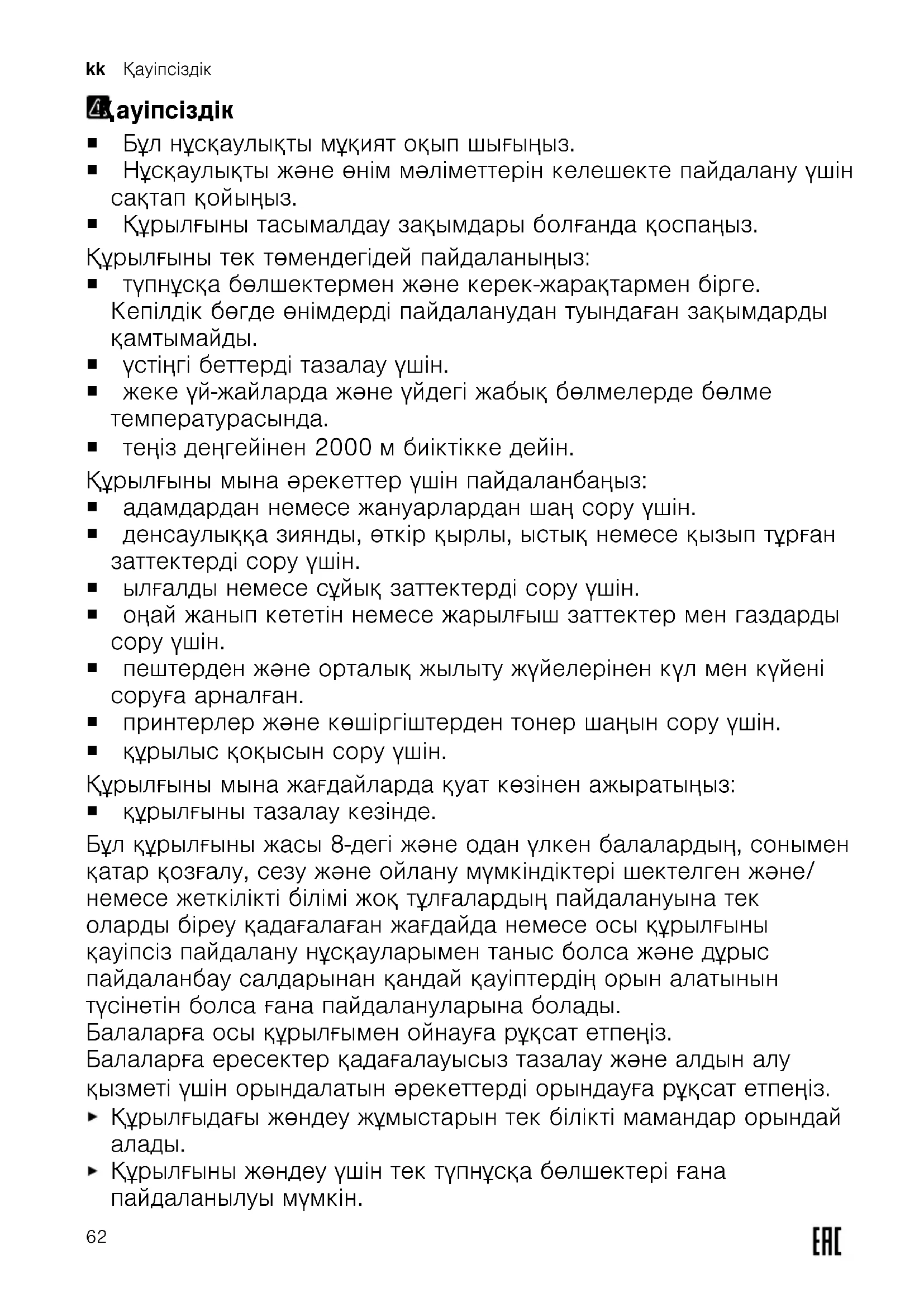 Құрылғыны тазалау үшін булап тазартқыш немесе жоғары басымдылықты булап тазартқышты пайдаланбаңыз. Еш жағдайда желі кабелін ыстық құрылғы бөліктеріне немесе жылу көздеріне тигізбеңіз. Желі кабелін өткір ұштарға немесе шеттерге тигізбеңіз. Желі кабелін бүкпеңіз, баспаңыз немесе өзгертпеңіз. Бұйымды тек қана бұйым тақташасында көрсетілген мәліметтері бойынша іске қосып қолданыңыз. Құрылғыны тек ережелер бойынша орнатылған жерге қосылған розетка арқылы айнымалы тоқ желісіне қосыңыз. Ішкі электр сымдарының жерге тұйықтау жүйесінің ережелерге сәйкес лайықты түрде орнатылуы тиіс. Тұтанғыш немесе құрамында спирт бар заттарды сүзгіге қолданбаңыз. Құрылғыны тазалаған кезде жанғыш немесе спиртті заттарды қолданбаңыз. Желілік кабельді толықтай суырып алыңыз. Киім, шаш, саусақ және басқа дене мүшелерін құрылғыдағы саңылаулардан және жылжымалы бөліктерден алшақ ұстаңыз. Еш жағдайда құбырды немесе саптамаларды көзге, шашқа, құлаққа немесе ауызға бағыттамаңыз. 63kk Материалдық залалдың алдын алу Сатыда тұрып шаң сорған кезде, құрылғы астында адамдардың жоқтығына көз жеткізіңіз. Жұмыста үзіліс жасаған кезде құрылғыны өшіріп, желілік ашаны суырып алыңыз. Желілік кабельді ішке тартыңыз. Кабель автоматты түрде тартылғанда, желілік аша адамдарға, дене мүшелеріне, жануарларға немесе заттарға лақтырылмағанына көз жеткізіңіз. Орама материалды балалардан алыс ұстаңыз. Балаларға орам материалдарымен ойнауға рұқсат етпеңіз. Материалдық залалдың алдын алуМатериалдық залалдың