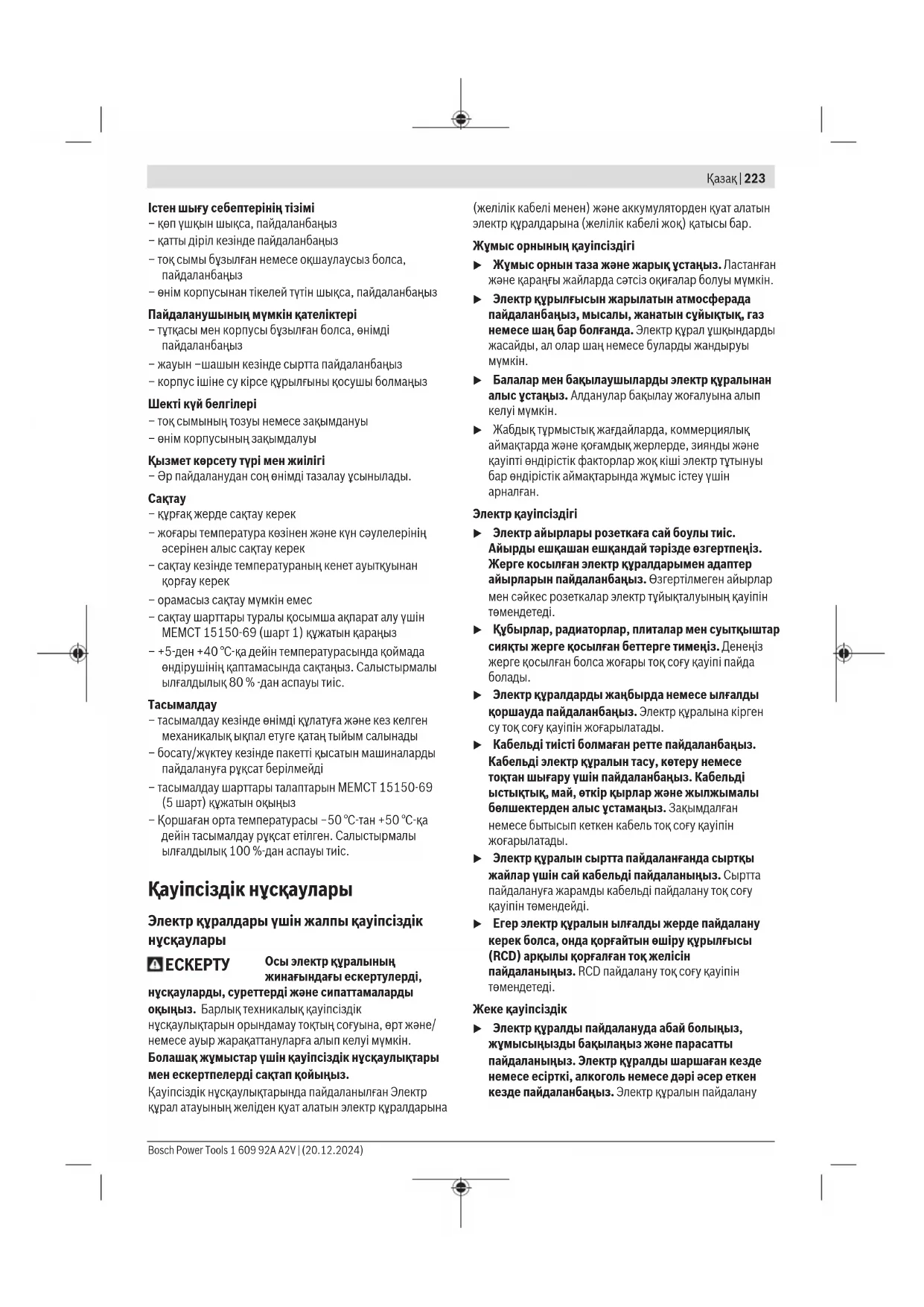 u Электр құралдарды жаңбырда немесе ылғалды қоршауда пайдаланбаңыз. Электр құралына кірген су тоқ соғу қауіпін жоғарылатады. u Кабельді тиісті болмаған ретте пайдаланбаңыз. Кабельді электр құралын тасу, көтеру немесе тоқтан шығару үшін пайдаланбаңыз. Кабельді ыстықтық, май, өткір қырлар және жылжымалы бөлшектерден алыс ұстамаңыз. Зақымдалған немесе бытысып кеткен кабель тоқ соғу қауіпін жоғарылатады. u Электр құралын сыртта пайдаланғанда сыртқы жайлар үшін сай кабельді пайдаланыңыз. Сыртта пайдалануға жарамды кабельді пайдалану тоқ соғу қауіпін төмендейді. u Егер электр құралын ылғалды жерде пайдалану керек болса, онда қорғайтын өшіру құрылғысы (RCD) арқылы қорғалған тоқ желісін пайдаланыңыз. RCD пайдалану тоқ соғу қауіпін төмендетеді. Жеке қауіпсіздік u Электр құралды пайдалануда абай болыңыз, жұмысыңызды бақылаңыз және парасатты пайдаланыңыз. Электр құралды шаршаған кезде немесе есірткі, алкоголь немесе дәрі әсер еткен кезде пайдаланбаңыз. Электр құралын пайдалану Bosch Power Tools 1 609 92A A2V | (20.12.2024)224 | Қазақ кезінде аңсыздық ауыр жеке жарақаттануға алып келуі