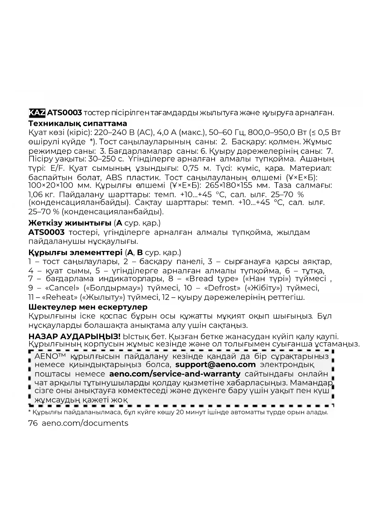 қ.aeno.com/documents 77 НАЗАР АУДАРЫҢЫЗ! Құрылғыны кез келген маталардан, сәндік бұйымдардан және басқа да жанғыш заттардан кемінде 1 метр қашықтықта орнатыңыз. НАЗАР АУДАРЫҢЫЗ! Тосттарды алу үшін металл заттарды (пышақ, шанышқы, қасық және т.б.) пайдаланбаңыз. Бұл құрылғы 14 жасқа толмаған балаларға немесе физикалық, ақыл-ой немесе ақыл-ой мүмкіндіктері шектеулі адамдарға, егер олардың құрылғыны пайдалану туралы жеткілікті тәжірибесі мен білімі болмаса және олардың жұмысына жауапты тұлғаның бақылауында болмаса, пайдалануға арналмаған. қауіпсіздік. Құрылғы тек тұрмыста қолдануға арналған. Құрылғыны сыртта пайдаланбаңыз. Құрылғы сыртқы таймер немесе қашықтан басқару жүйесі арқылы басқаруға арналмаған. Балаларға құрылғымен немесе компоненттері ойнауға рұқсат бермеңіз. Зақымдалған құрылғыны пайдаланбаңыз. Құрылғыны тастамаңыз немесе лақтырмаңыз. Техникалық құжаттамада көрсетілген кернеу мен жиілік қуат көзінің параметрлеріне сәйкес келетініне көз жеткізіңіз. Құрылғыны тек құрғақ қолмен басқарыңыз. Тостерді тек нан пісіру үшін пайдаланыңыз. Майланған немесе пішіні бұзылған нанды пайдаланбаңыз. Құрылғы жұмыс істеп тұрған кезде оны қараусыз қалдырмаңыз. Қолданғаннан кейін және тазалау алдында құрылғыны электр желіден ажыратыңыз. Құрылғыны розеткадан қуат сымынан емес, ашасынан ұстап ажыратыңыз. Құрылғыны немесе оның элементтері бөліктерін суға батырмаңыз немесе ағын судың астына қоймаңыз. Қуат сымының бұралмағанын, майылмағанын, ешнәрсеге қысылмауын немесе ыстық, өткір заттармен немесе жылу көздерімен жанаспағанын тексеріңіз. Құрылғыны балалардың қолы жетпейтін жерде сақтаңыз. Құрылғыны тазалау үшін химиялық агрессивті жуғыш заттарды, абразивті пасталарды, құрамында қышқылдар немесе еріткіштер бар өнімдерді немесе металл губкаларды пайдаланбаңыз. Құрылғының толық сипаттамасын, оның режимдері мен функцияларын aeno.com/documents сайтында қол жетімді толық пайдаланушы нұсқаулығын. Құрылғыны басқару элементтері (B сур. қар.) Режимді/бағдарламаны таңдау үшін сәйкес түймені басыңыз. Қызару дәрежелерінің таңдау үшін реттегішті бұраңыз.78 aeno.com/documents